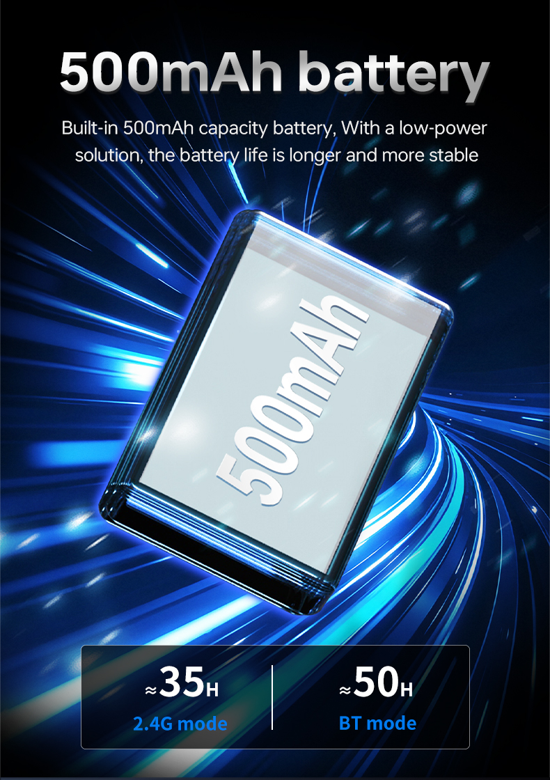 6. Long-Lasting Battery: Built-in 500mAh battery supporting up to ~50 hours in bluetooth mode and ~35 hours in 2.4GHz mode.