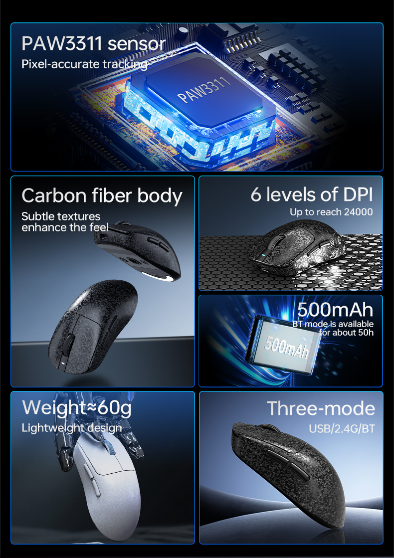 2. High-Precision Sensor: Equipped with PAW3311 e-sports-grade optical sensor for accurate tracking and control.