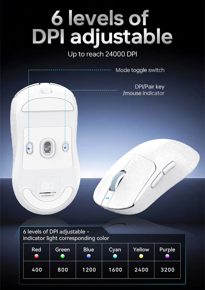 4. Adjustable DPI Levels: 6 DPI modes adjustable up to 24000 DPI, featuring indicator lights for easy customization.