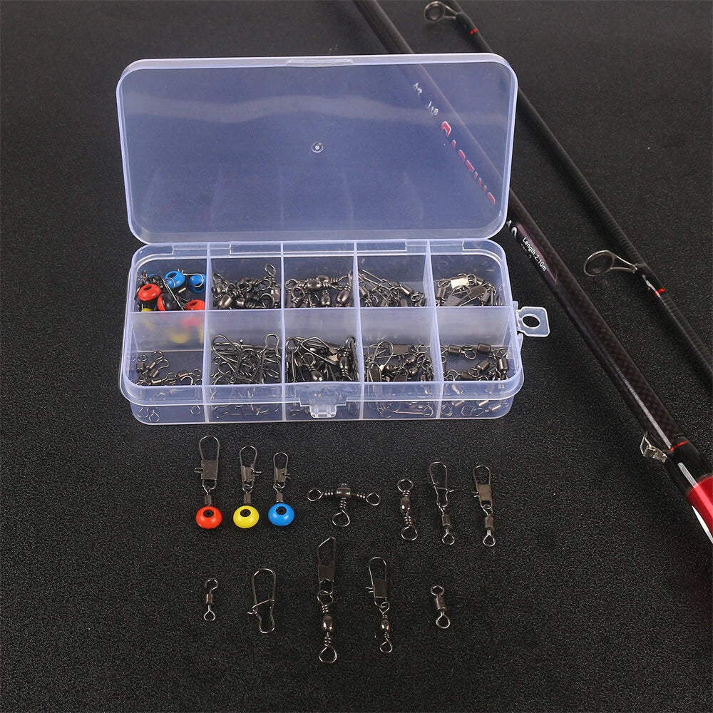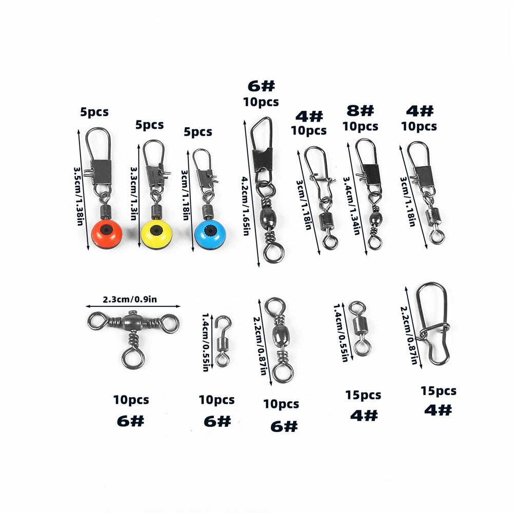 Features:1. Experience fishing with our 115pcs Fishing Swivels Connector Set, feature Bearing for smooth rotation and operate.2. These high quality swivels are to withstands both saltwater and freshwater conditions, making perfect for fishing adventure.3. For anglers, enthusiasts, and professional fishermen, this Swivels connector caters to anyone about fishing, from hobbyists to competitive participants.4. Whether you're casting your line in the ocean, lake, or rivers, these connectors are suitable for catching a variety of fish including sea bass, and trout.5. Enhances your fishing efficiency with our easy to use connectors that allow for quick changes and adjustments, ensuring you spend more reeling in your catch and less time fiddling with gear.