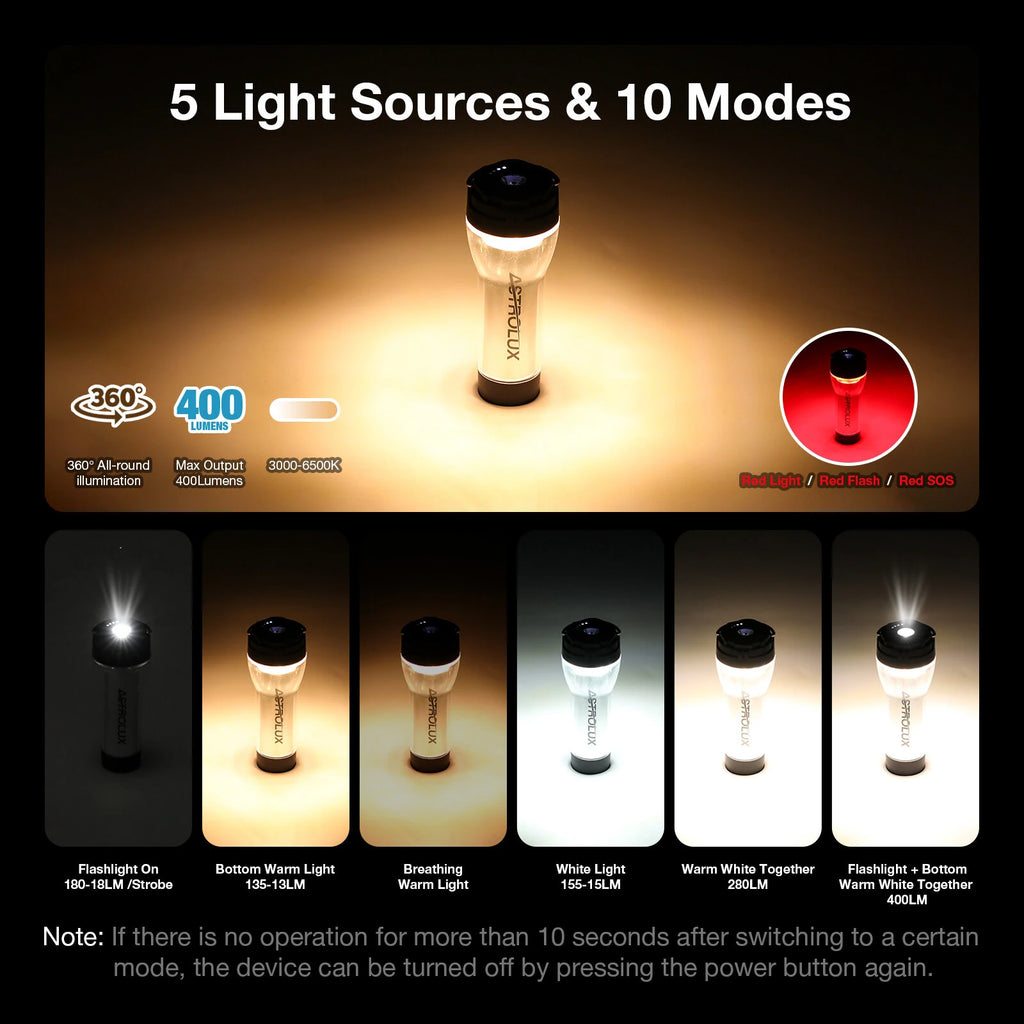 Modes | -Top Flashlight 180-18LM, -Top Flashlight Strobe , -Bottom Warm Light 135-13LM, -Bottom Breathing Warm Light, -Bottom White Light: 155-15LM, -Bottom Warm White Together: 280LM, Three Red Light Modes: -Red Light/Red Flash/Red SOS -Flashlight + Bottom Warm White Together: 400LM Note: If there is no operation for more than 10 seconds after switching to a certain mode, the device can be turned off by pressing the power button again. |