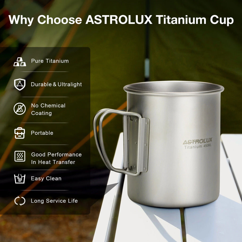 The titanium construction is endurable enough to last a long time even under heavy loads or high temperatures. High tolerance to very low or very high temperatures makes it the best choice for outdoor camping, backpacking, hiking, jungle exploration.Outstanding Design: Recessed cup lid design, effectively reduces the leakage of water droplets on the lid and keep the heat. The foldable handle is easy to use and store, perfect for backpacking, camping, hiking and traveling.-Easy To Carry: Easily folds into a compact size and comes with a carry bag for easy storage in gear bags, the back of your car and many other places! Astrolux camping cup is a great gift for friends or family who love the outdoors.-Multifunctional: This titanium mug can be used as a small cooking pot, tea cup or coffee cup. Safe and healthy, it will not leave any metallic smell and taste, and keep the natural flavor of beverages and food. Reusable and always keep in excellent quality.
