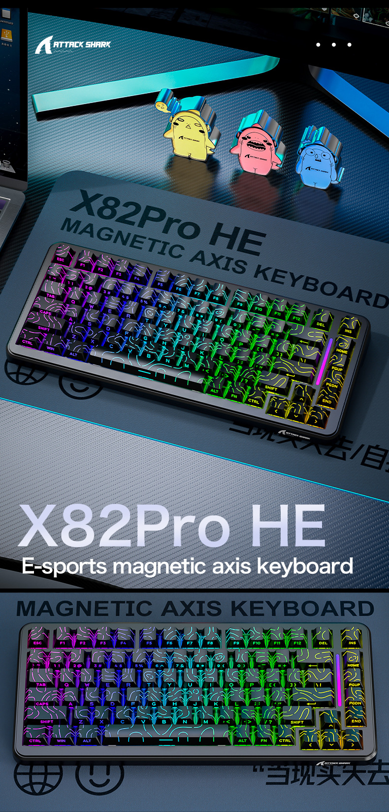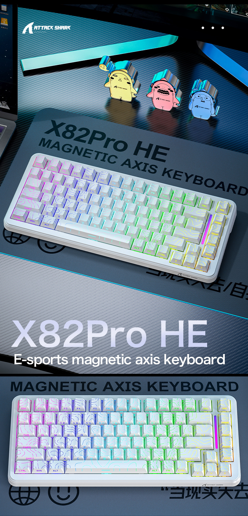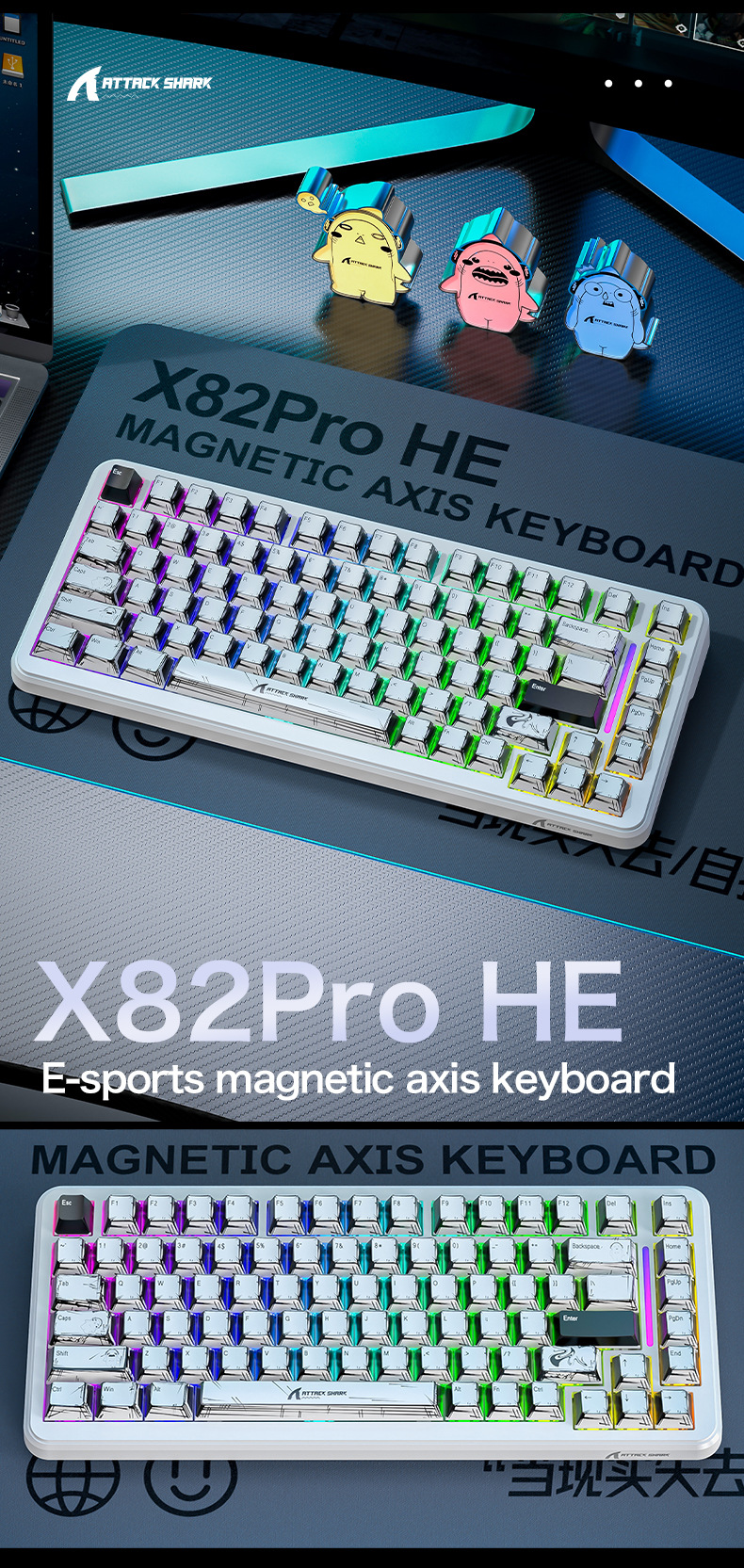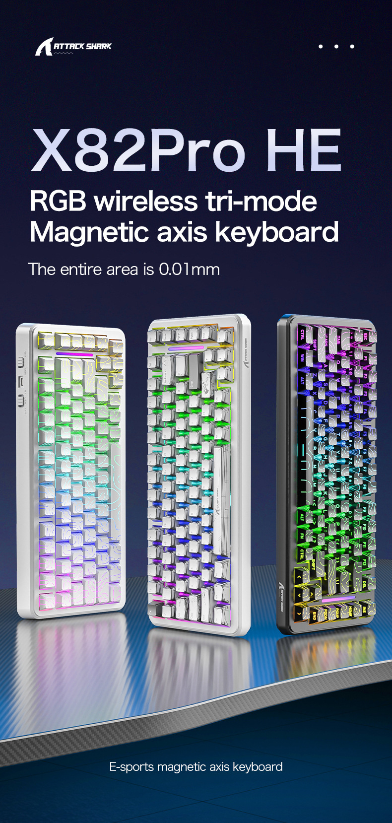 Brand: Attack SharkModel: X82Pro HEConnection Modes: Wired (Type-C), 2.4G Wireless, bluetoothReturn Rate: 8000Hz (Wired), 1000Hz (Wireless)Lighting: RGB LightingKey Cover Process: PBT two-color injection molding, PBT five-sided thermal sublimationBattery Capacity: 5000mAh Lithium Rechargeable BatteryShaft Body Accuracy: The 0.01mmDimensions: 145mm (width) x 330mm (length) x 40mm (height)Weight: Approximately 780g ±10g (excluding wire)Features:- ATTACK SHARK Self-developed Magnetic Switch- The first ATTACK SHARK Comic Version Keycaps- Tri-Mode Connection- 0.01mm Rapid Trigger Accuracy, Zero Dead Zone- Up to 8000Hz Polling Rate- 0.125ms Latency, 128K Scan Rate- Adjustable Actuation Points (0.1-3.4mm)- 5000mAh Long Battery Life- Top structure, 2 layers of PORON Cotton- Snap tap and Last Keystroke Prioritization- One Key,Multiple Actions (DKS)- Web Driver & On-board Memory- Gorgeous RGB BacklightPackage Include:1x Attack Shark X82Pro HE Keyboard1x Data Cable1x USB Receiver1x Keycap Puller1x Switch Puller1x Dustproof Cap1x Manual