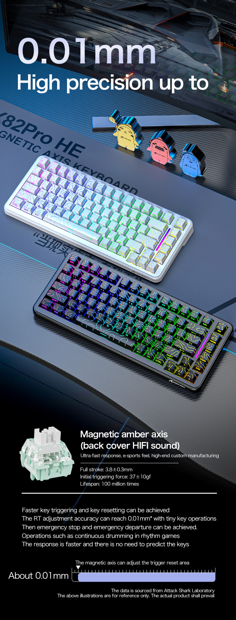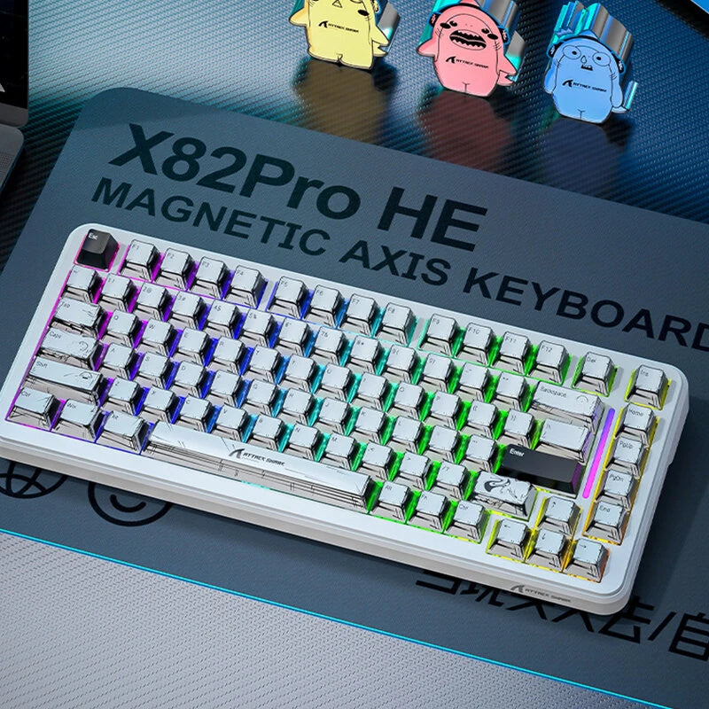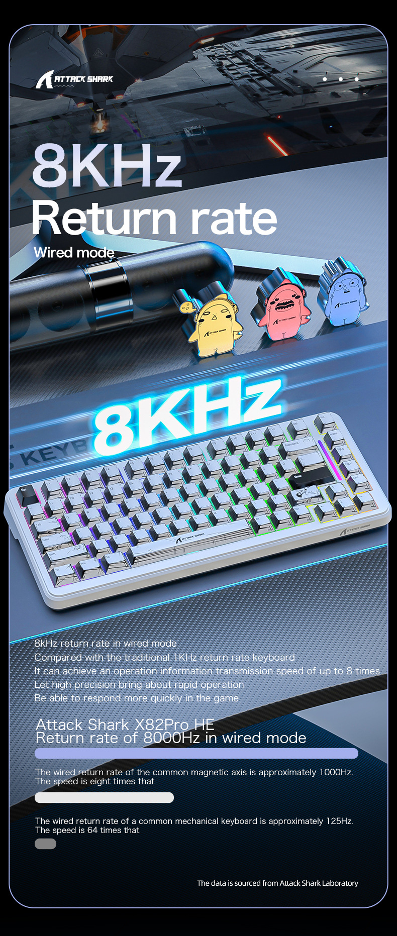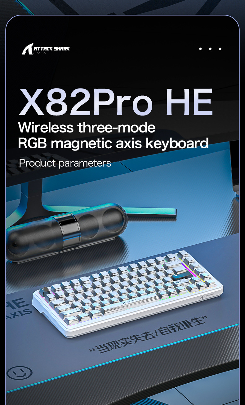 Brand: Attack SharkModel: X82Pro HEConnection Modes: Wired (Type-C), 2.4G Wireless, bluetoothReturn Rate: 8000Hz (Wired), 1000Hz (Wireless)Lighting: RGB LightingKey Cover Process: PBT two-color injection molding, PBT five-sided thermal sublimationBattery Capacity: 5000mAh Lithium Rechargeable BatteryShaft Body Accuracy: The 0.01mmDimensions: 145mm (width) x 330mm (length) x 40mm (height)Weight: Approximately 780g ±10g (excluding wire)Features:- ATTACK SHARK Self-developed Magnetic Switch- The first ATTACK SHARK Comic Version Keycaps- Tri-Mode Connection- 0.01mm Rapid Trigger Accuracy, Zero Dead Zone- Up to 8000Hz Polling Rate- 0.125ms Latency, 128K Scan Rate- Adjustable Actuation Points (0.1-3.4mm)- 5000mAh Long Battery Life- Top structure, 2 layers of PORON Cotton- Snap tap and Last Keystroke Prioritization- One Key,Multiple Actions (DKS)- Web Driver & On-board Memory- Gorgeous RGB BacklightPackage Include:1x Attack Shark X82Pro HE Keyboard1x Data Cable1x USB Receiver1x Keycap Puller1x Switch Puller1x Dustproof Cap1x Manual