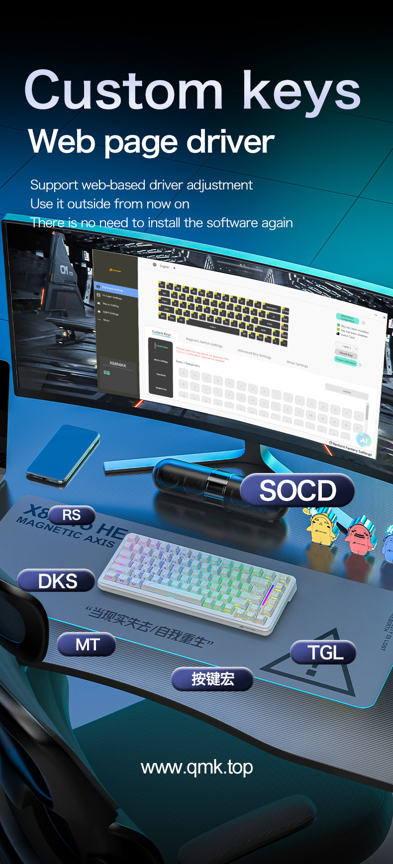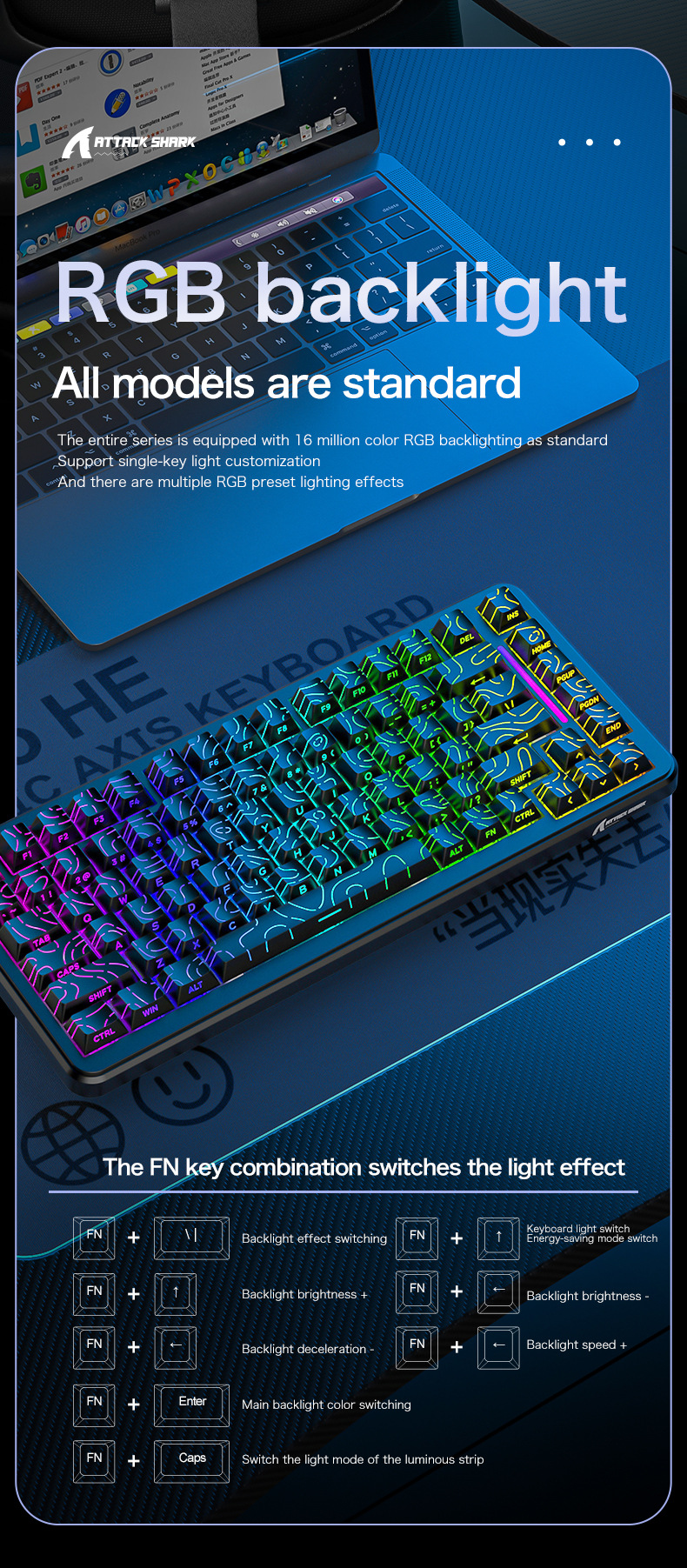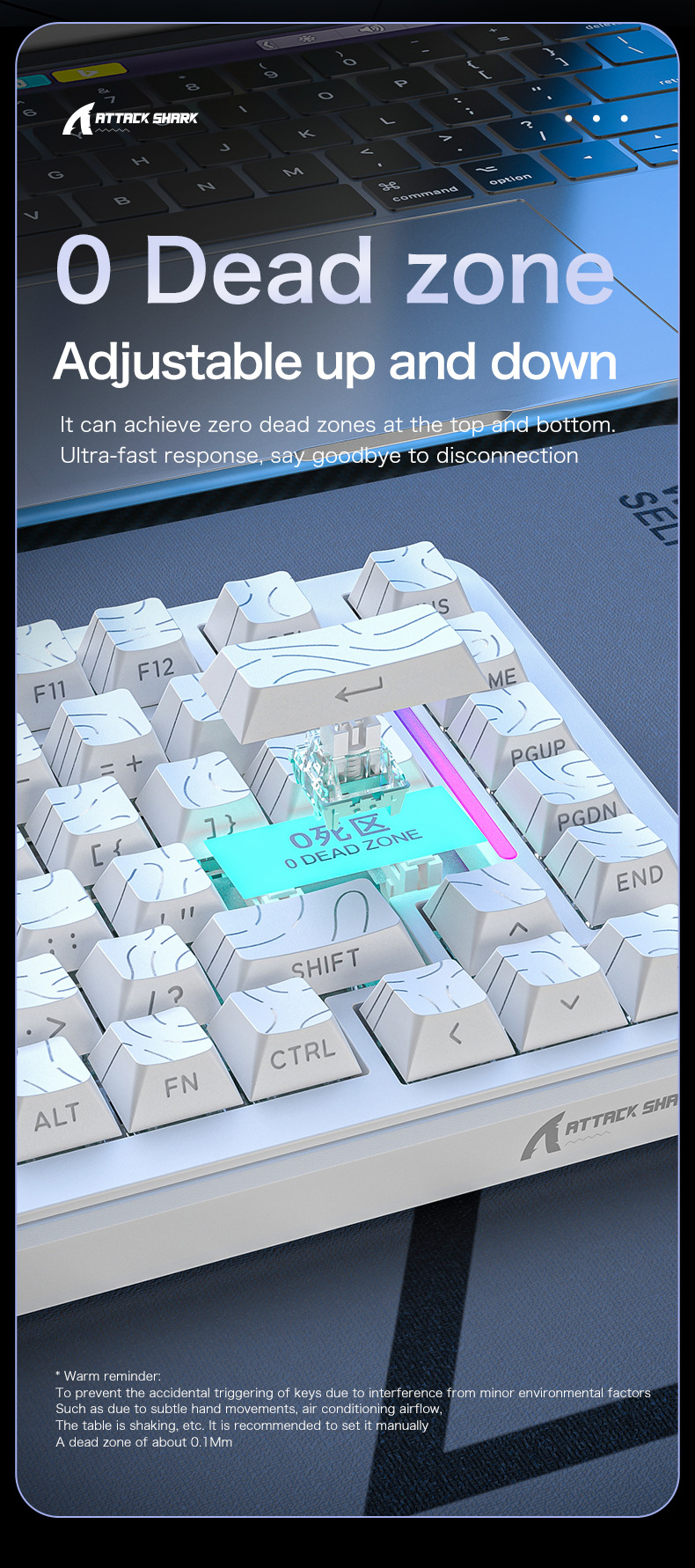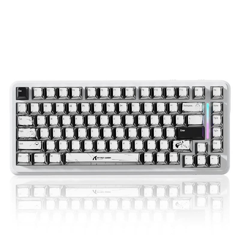 Brand: Attack SharkModel: X82Pro HEConnection Modes: Wired (Type-C), 2.4G Wireless, bluetoothReturn Rate: 8000Hz (Wired), 1000Hz (Wireless)Lighting: RGB LightingKey Cover Process: PBT two-color injection molding, PBT five-sided thermal sublimationBattery Capacity: 5000mAh Lithium Rechargeable BatteryShaft Body Accuracy: The 0.01mmDimensions: 145mm (width) x 330mm (length) x 40mm (height)Weight: Approximately 780g ±10g (excluding wire)Features:- ATTACK SHARK Self-developed Magnetic Switch- The first ATTACK SHARK Comic Version Keycaps- Tri-Mode Connection- 0.01mm Rapid Trigger Accuracy, Zero Dead Zone- Up to 8000Hz Polling Rate- 0.125ms Latency, 128K Scan Rate- Adjustable Actuation Points (0.1-3.4mm)- 5000mAh Long Battery Life- Top structure, 2 layers of PORON Cotton- Snap tap and Last Keystroke Prioritization- One Key,Multiple Actions (DKS)- Web Driver & On-board Memory- Gorgeous RGB BacklightPackage Include:1x Attack Shark X82Pro HE Keyboard1x Data Cable1x USB Receiver1x Keycap Puller1x Switch Puller1x Dustproof Cap1x Manual