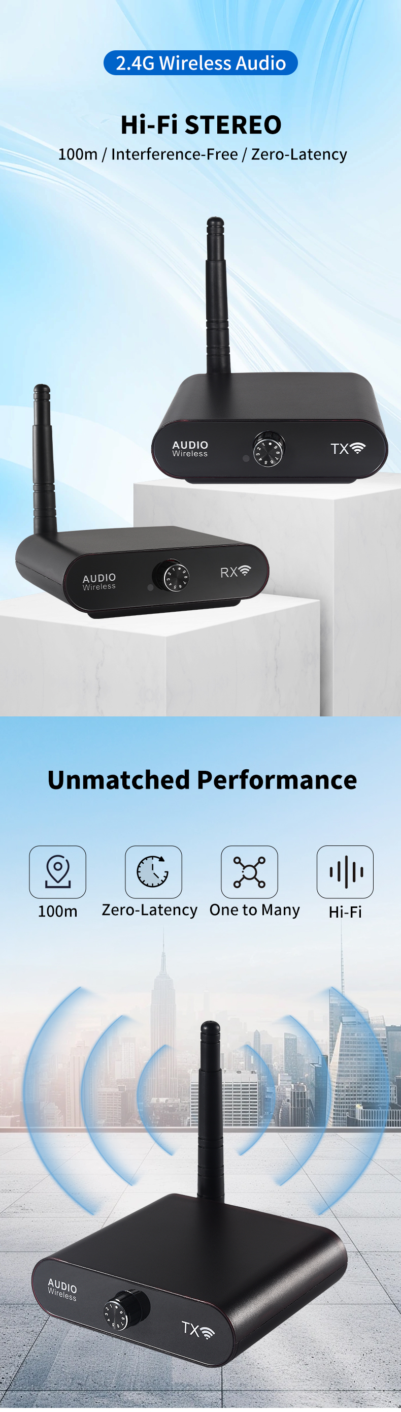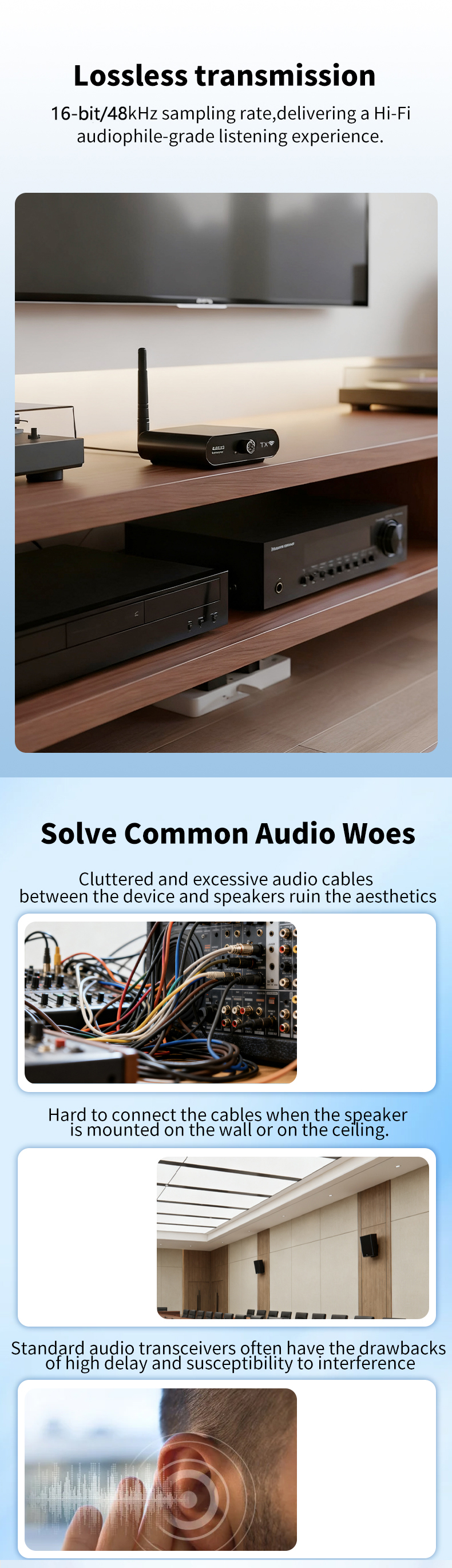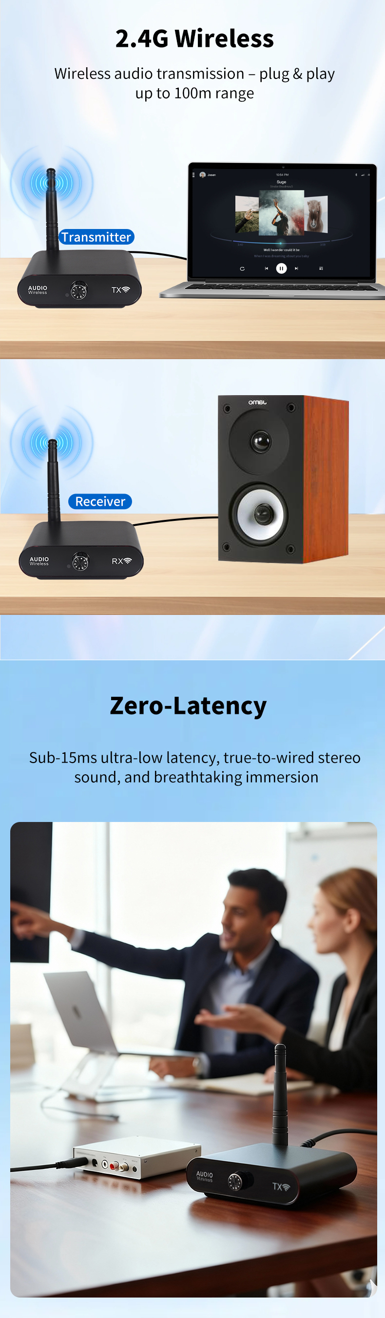 1. Zero-Latency Transmission: Enjoy consistent sub-15ms low latency for real-time audio synchronization.