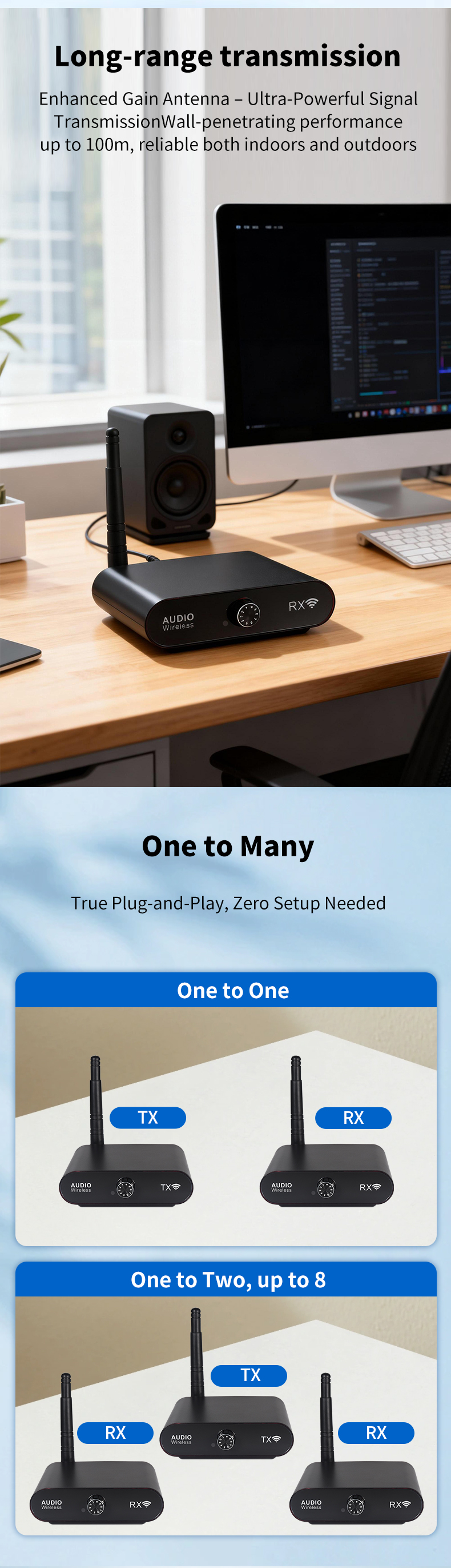 4. One-to-Many Device Connectivity: Supports up to 8 receivers simultaneously without the need for additional setup.