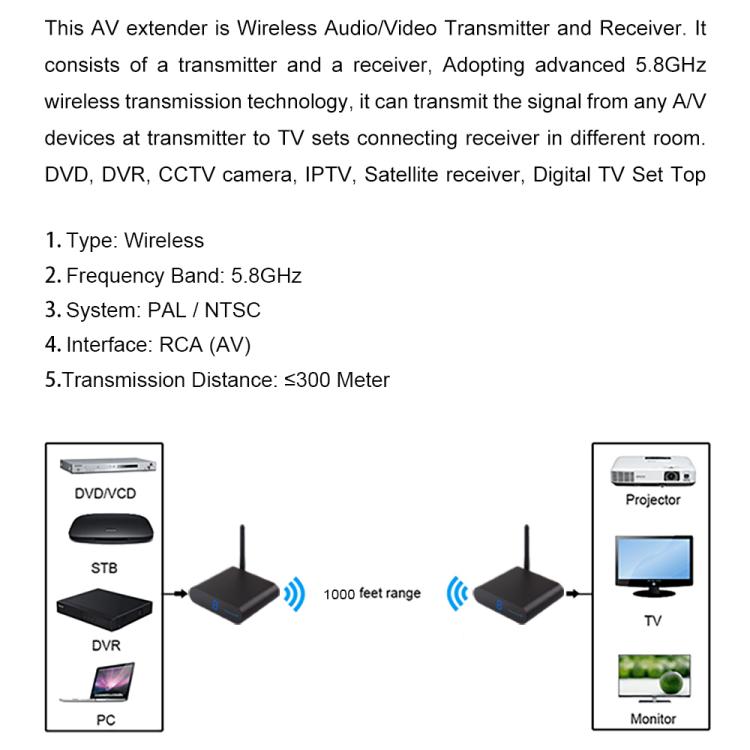 AV530 is Wireless Audio/Video Transmitter and Receiver. It consists of a transmitter and a receiver, Adopting advanced 5.8GHz wireless transmission technology, it can transmit the signal from any A/V devices at transmitter to TV sets connecting receiver in different room. DVD, DVR, CCTV camera, IPTV, Satellites receiver, Digital TV Set Top Box etc.