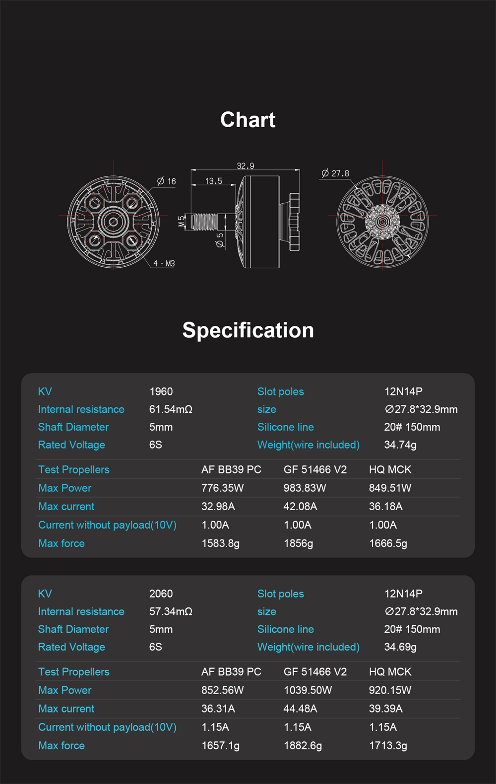 KV: 2060 Slot Poles: 12N14P Internal Resistance: 57.34mΩ Size: φ27.8*32.9mm Shaft Diameter: 5mm Silicone Line: 20# 150mm Rated Voltage: 6S Weight(Wire included): 34.69g |