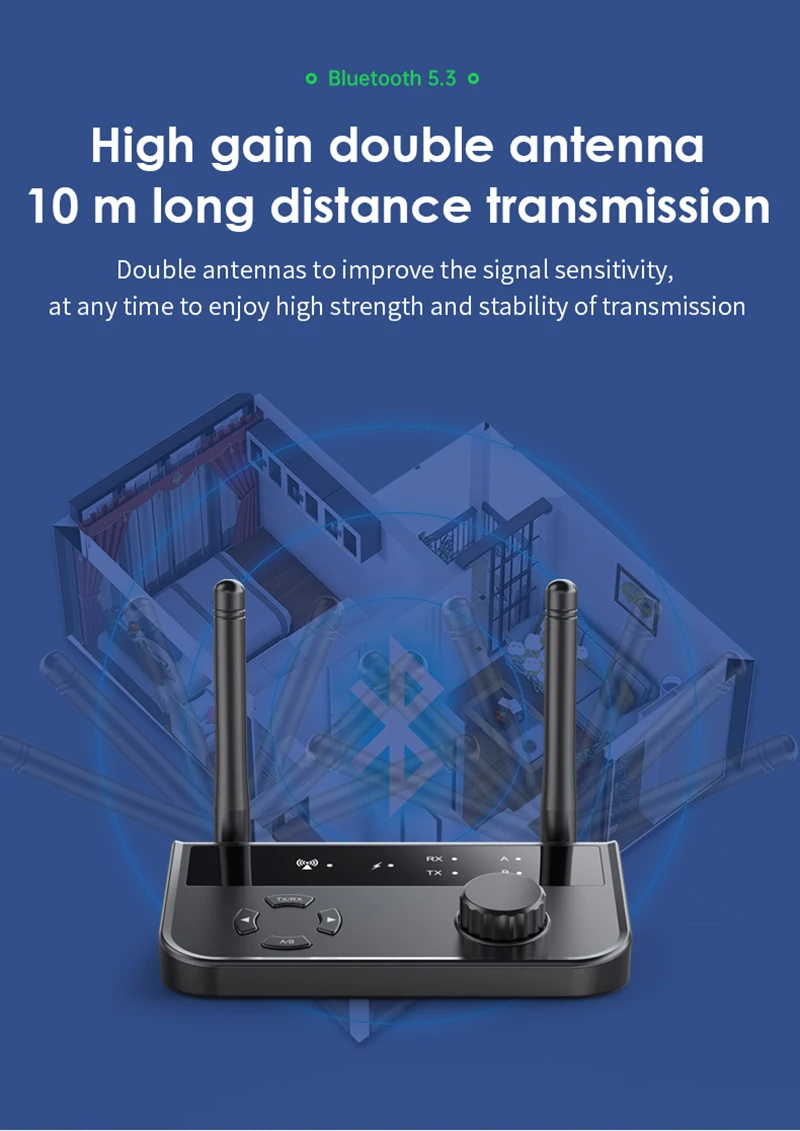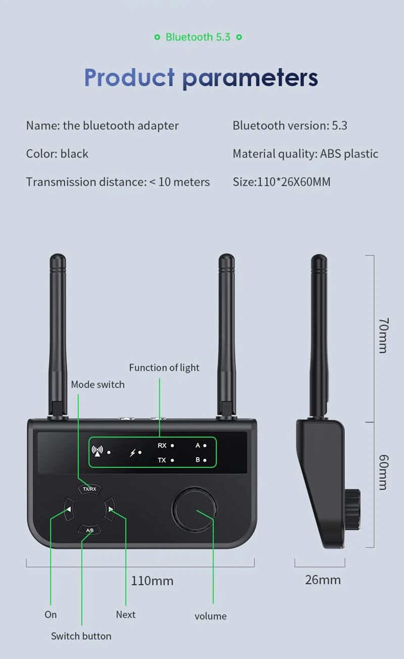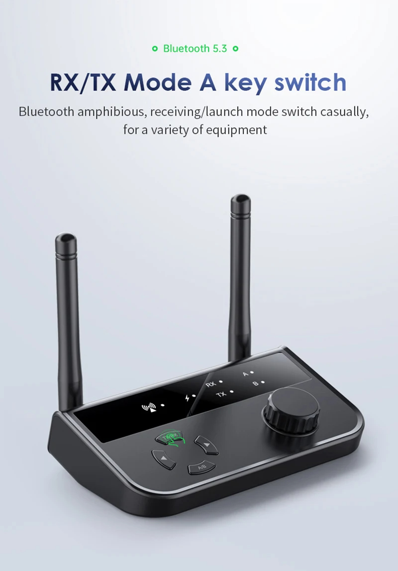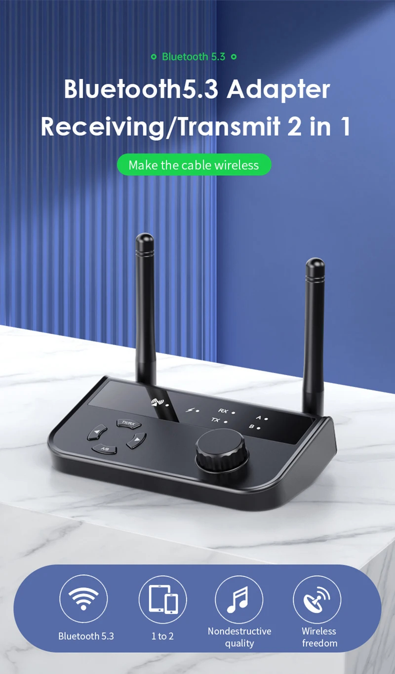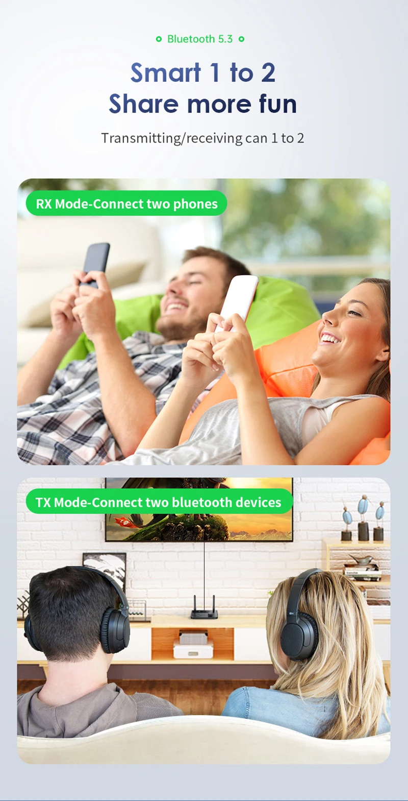 1. 2-in-1 bluetooth 5.3 Audio Adapter: Easily transmit audio from non-bluetooth sources like TV, PC, or CD player to bluetooth headphones and speakers, or receive audio from bluetooth sources on non-bluetooth devices.