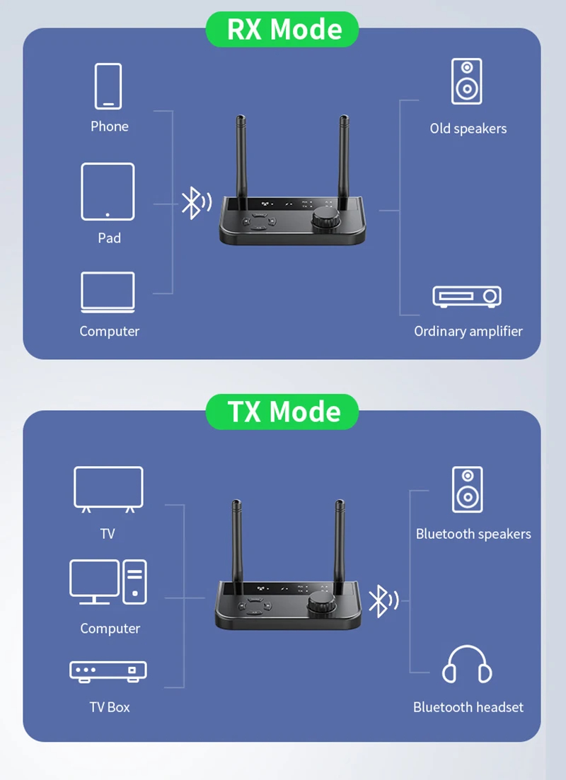2. Supports Dual Connections: Connect up to 2 bluetooth headsets in transmitter mode or up to 2 smartphones in receiver mode.
