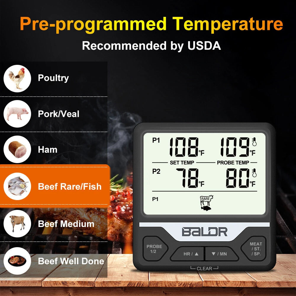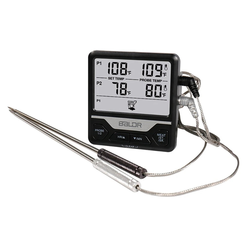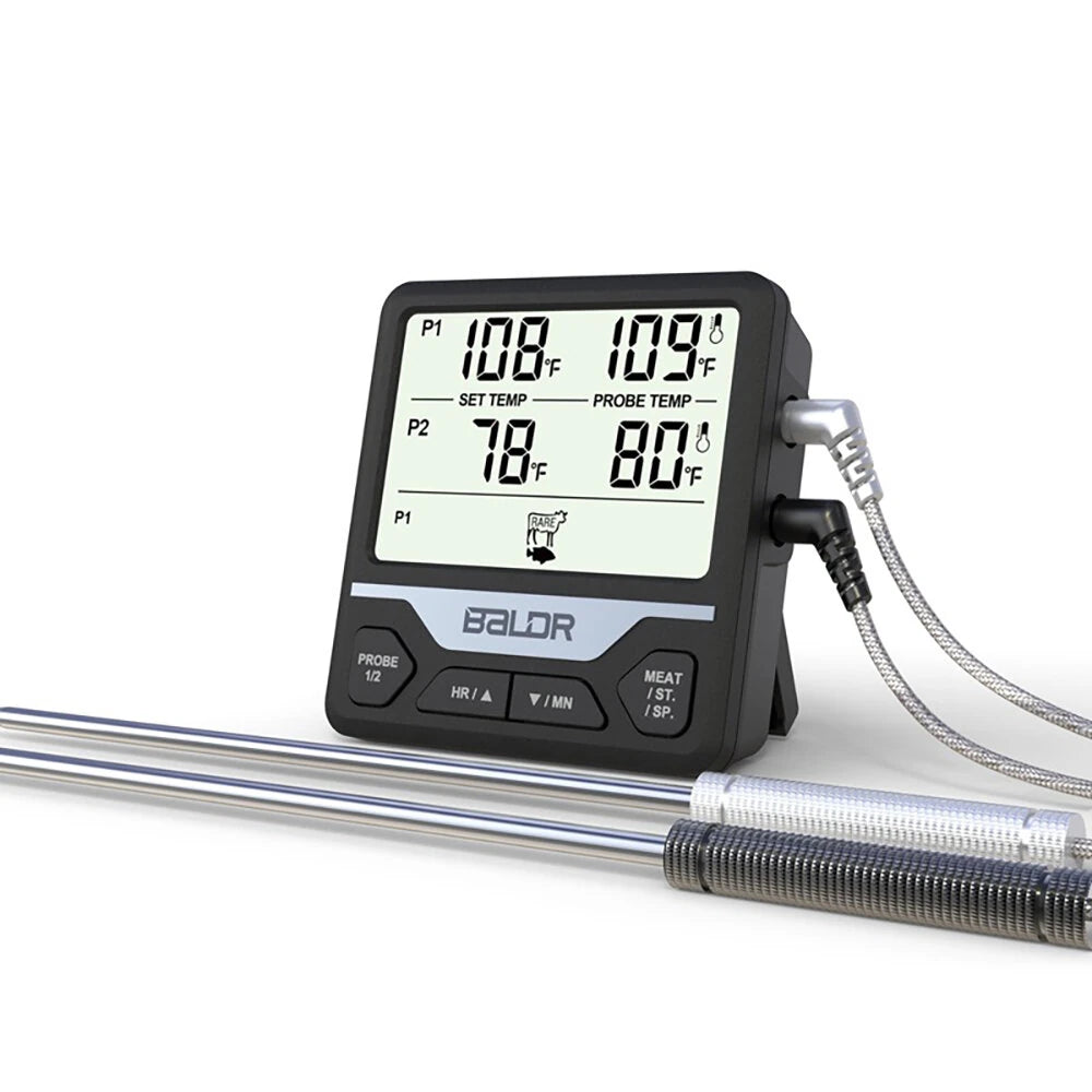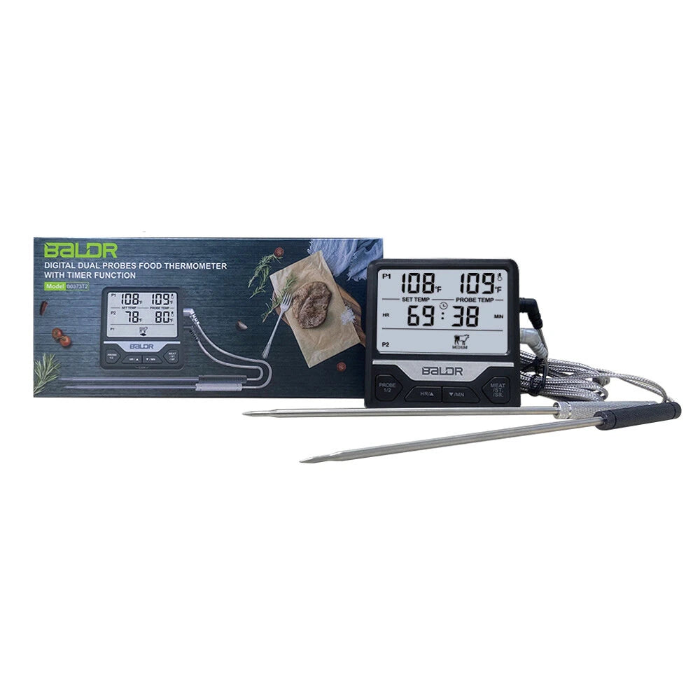 -- The BALDR Food Temperature Thermometer features two high-precision probes made from food-grade stainless steel, ensuring safety and accuracy. These dual probes are capable of measuring the internal temperature of various meats and other foods quickly and precisely. With a temperature range of -10℃ to 300℃ (14℉ to 572℉) and an accuracy of ±1℃ (1.8℉), this thermometer delivers reliable results in a matter of 30 seconds.
