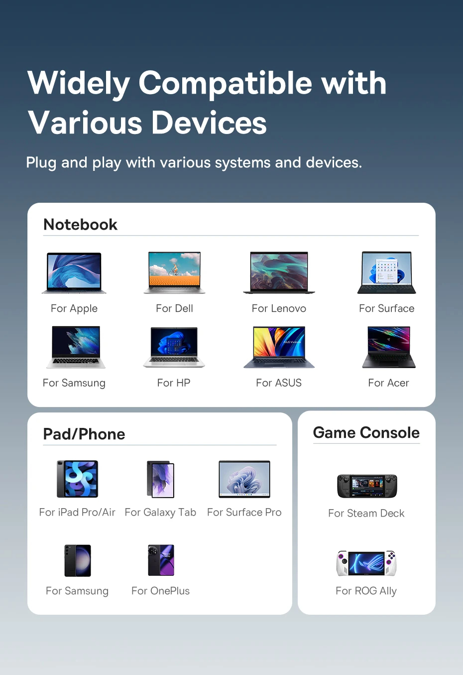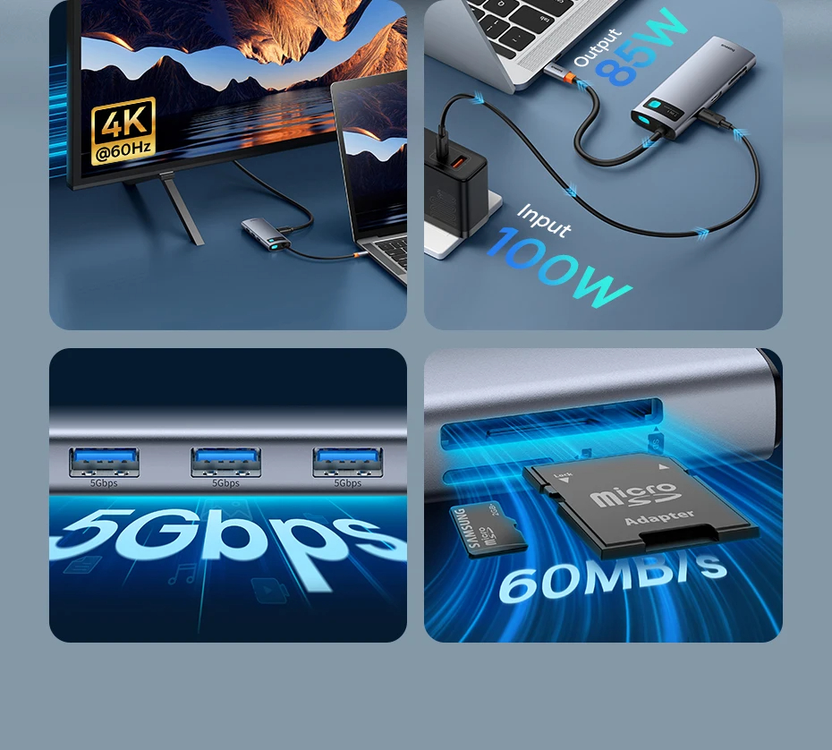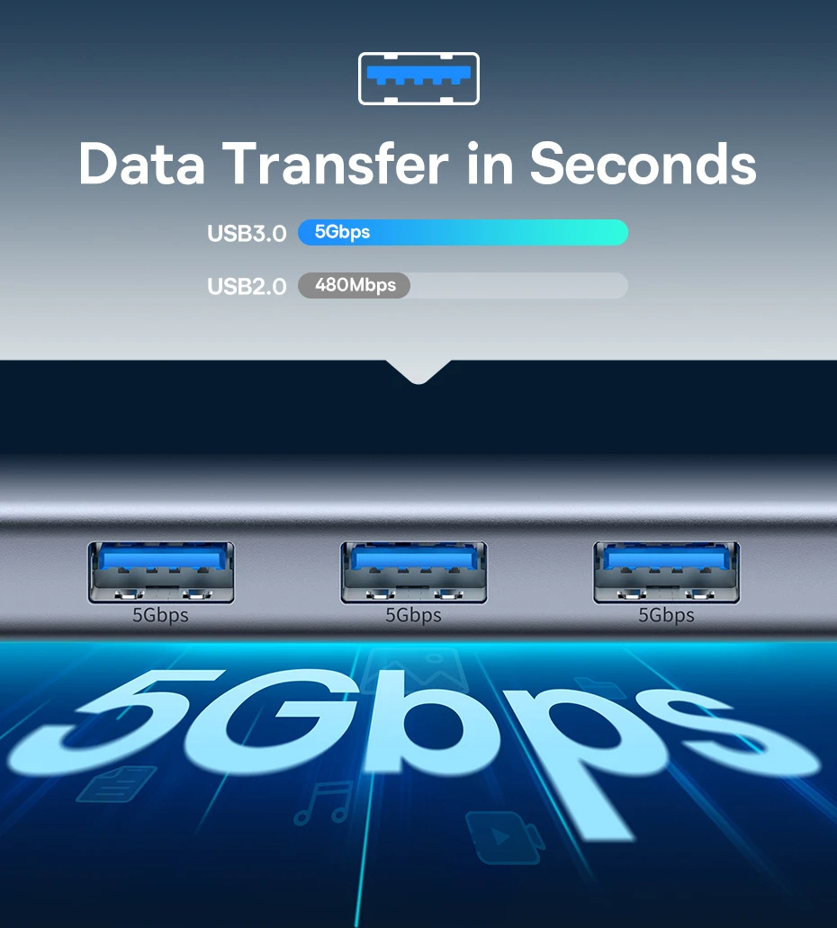 1. Multiple Ports:Includes 3 USB 3.0 ports for high-speed data transfer at 5Gbps.