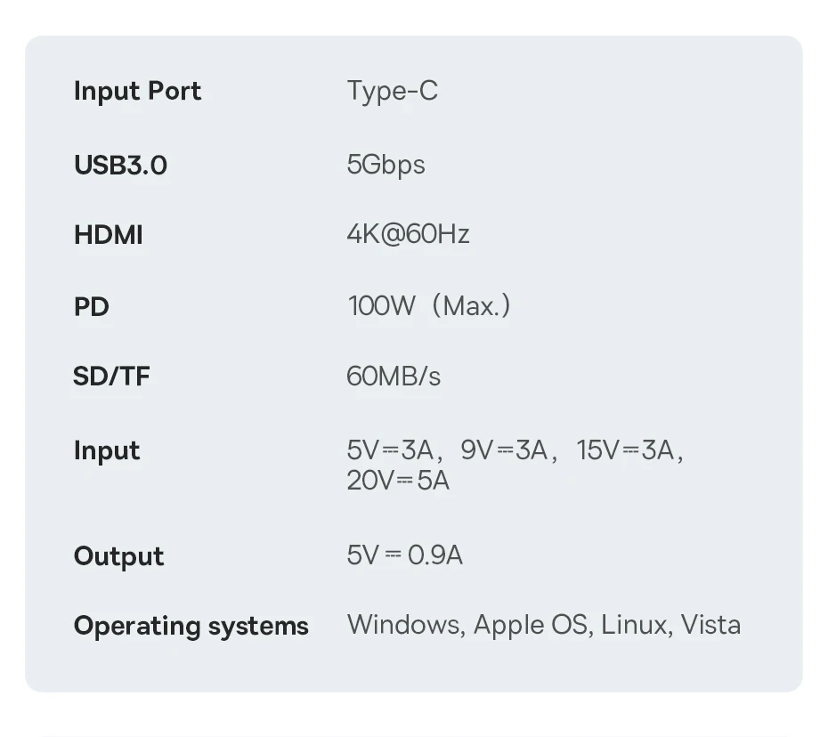 Output Interface | USB3.0*3 / PD100W Type-C / 4K@60Hz HD / SD&TF Card Reader Slot |