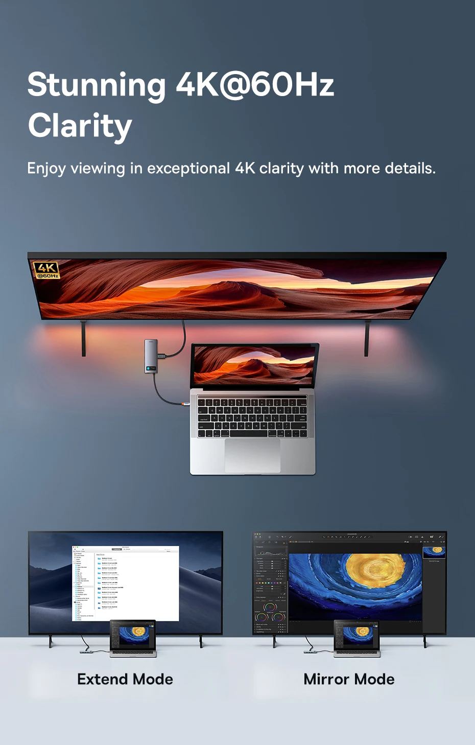 Supports 4K resolution at 60Hz, providing exceptional clarity for extended and mirror display modes.