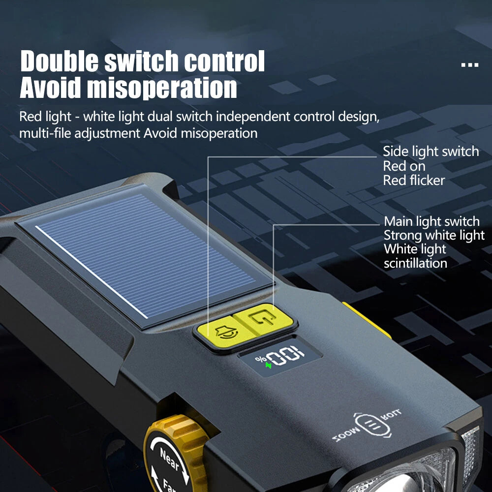 1. Power Display Function: This bicycle headlight has an intuitive power display, allowing riders to easily monitor the battery status, ensuring that they will not be caught off guard during riding.2. Dual Charging Methods: This bicycle headlight is equipped with solar and Type-C USB charging options, providing multiple power sources, environmentally friendly and convenient, suitable for all riding conditions.3. Adjustable beam focus: This ultra-bright bicycle light adopts a rotatable lens design, which can be easily adjusted between high light and low beam settings to adapt to various riding environments.
