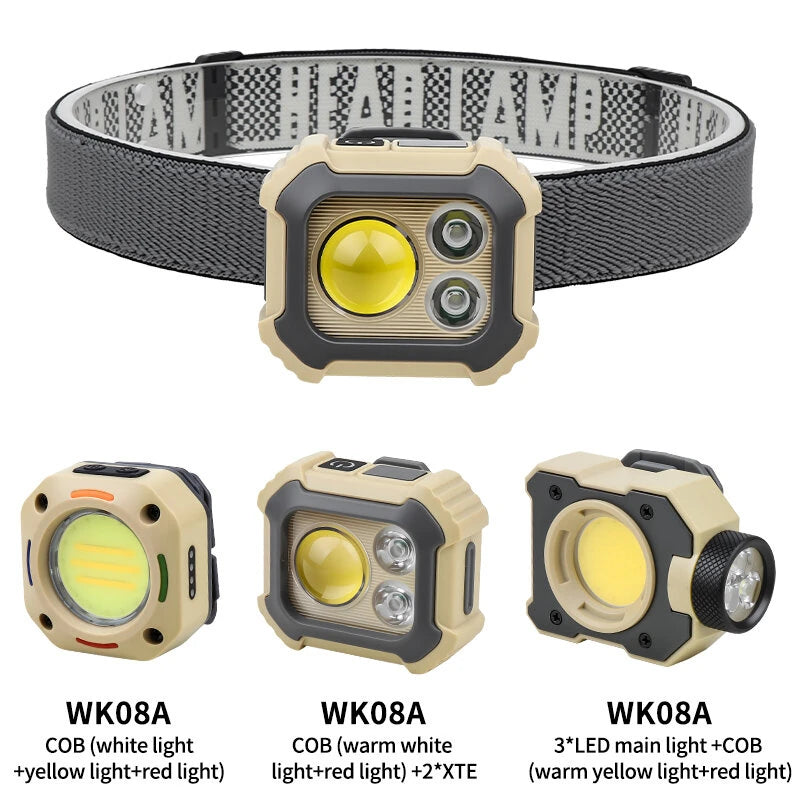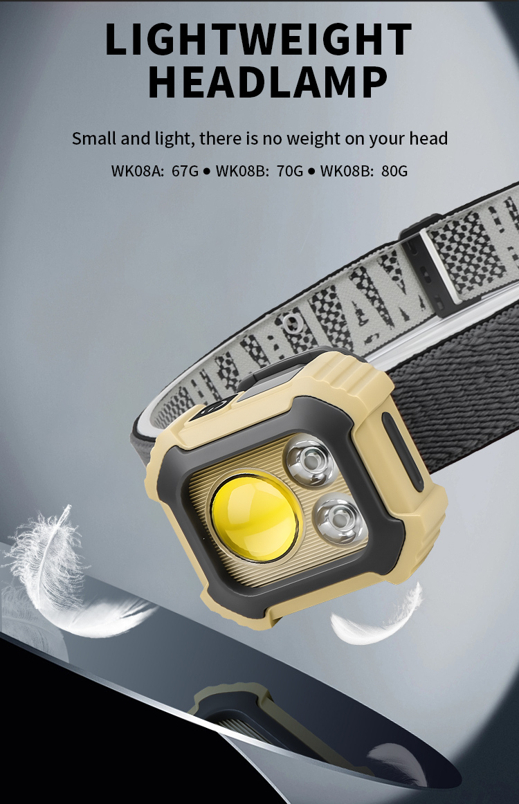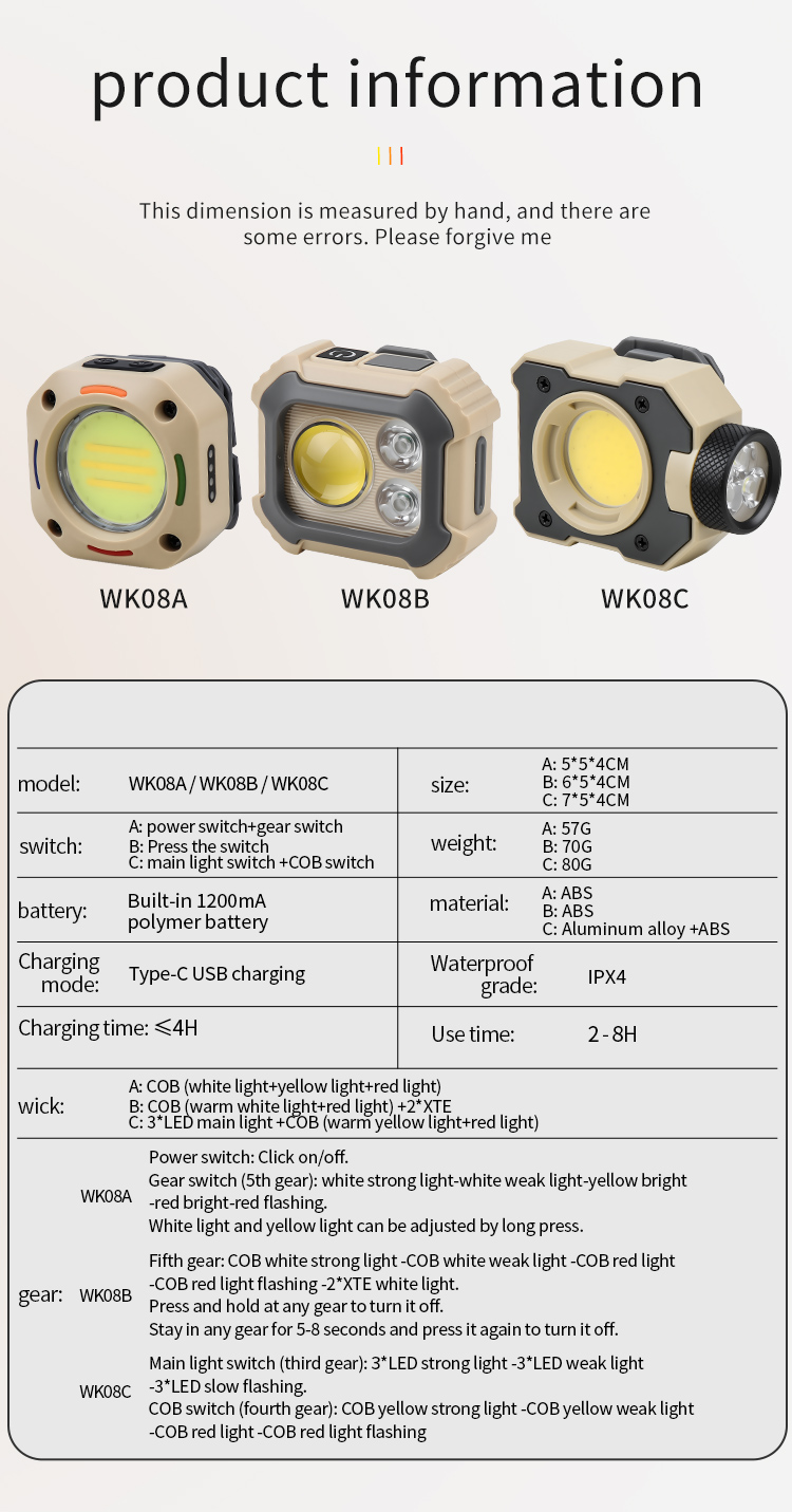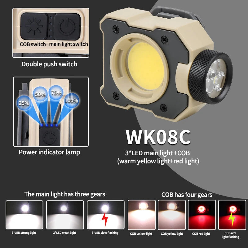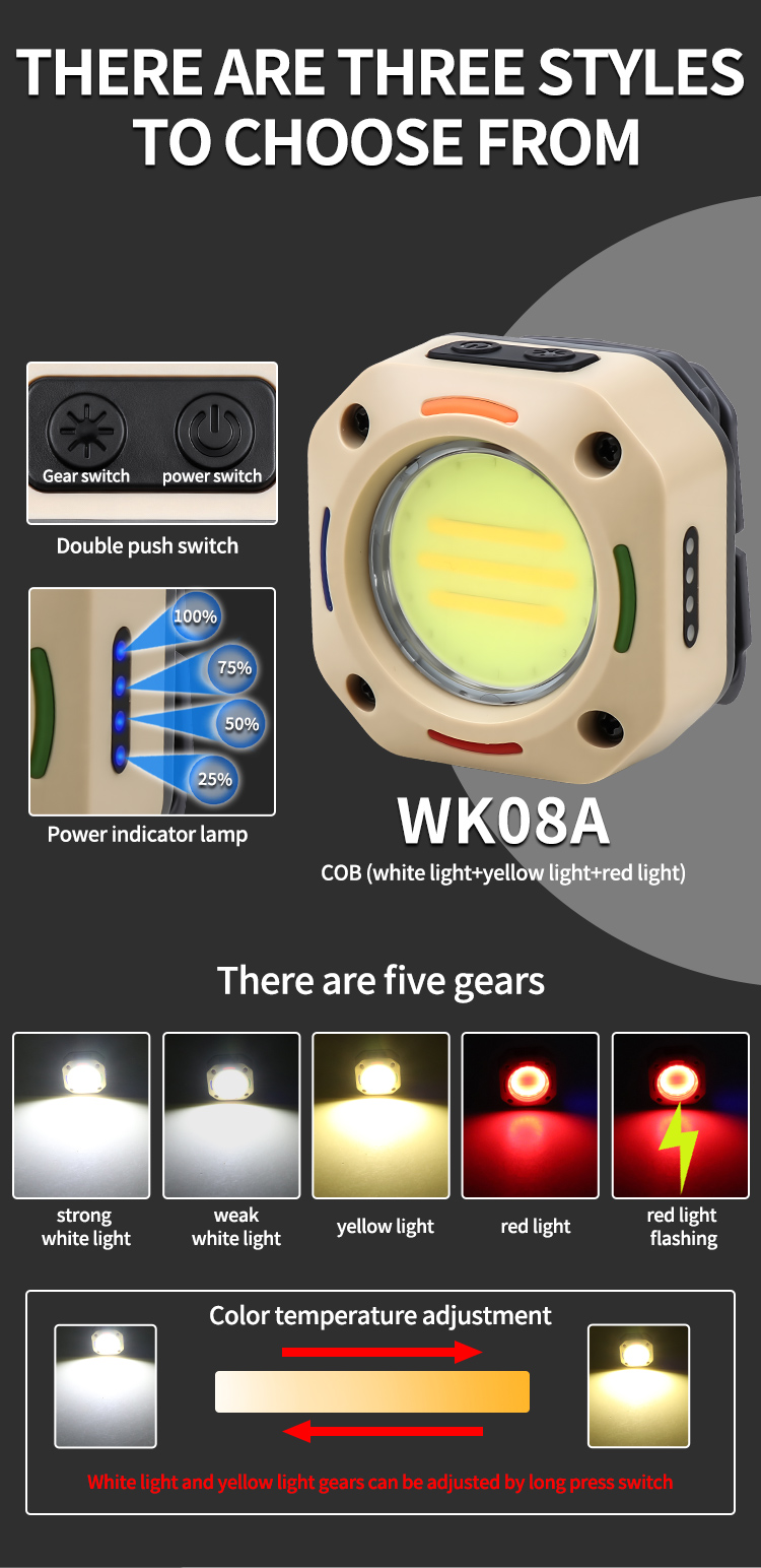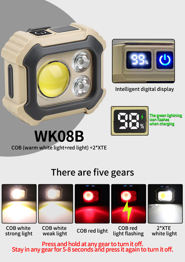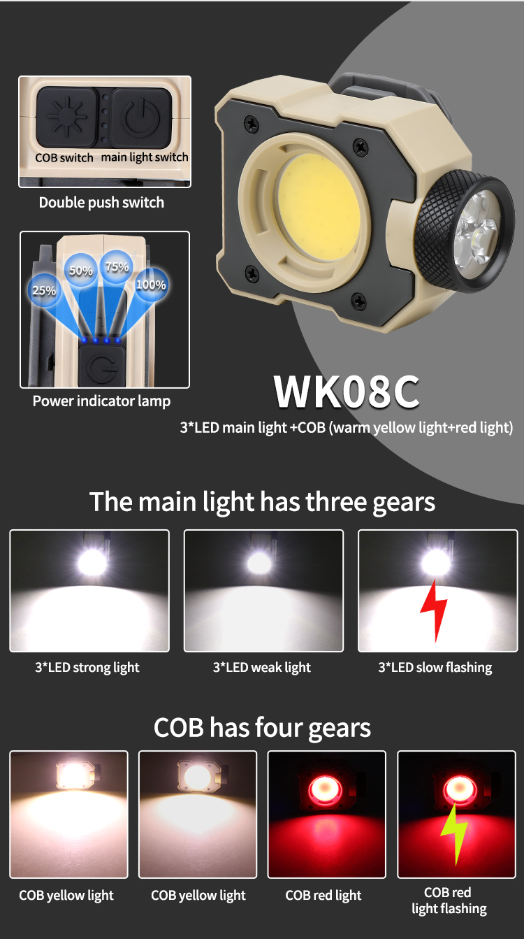 | Gear | WK08A: Power Switch: Click on/off Gear Switch (5th gear): white strong light-white weak light-yellow bright-red bright-red flashing White light and yellow light can be adjusted by long press WK08B: Fifth Gear: COB white strong light-COB white weak light-COB red light -COB red light flashing -2*XTE white light Press and hold at any gear to turn it off Stay in any gear for 5-8 seconds and press it again to turn it off WK08C: Main light switch(third gear): 3*LED stronglight-3*LED weak light-3*LED slow flashing COB switch (fourth gear): COB yellow strong light -COB yellw weak light-COB red light-COB red light flashing |