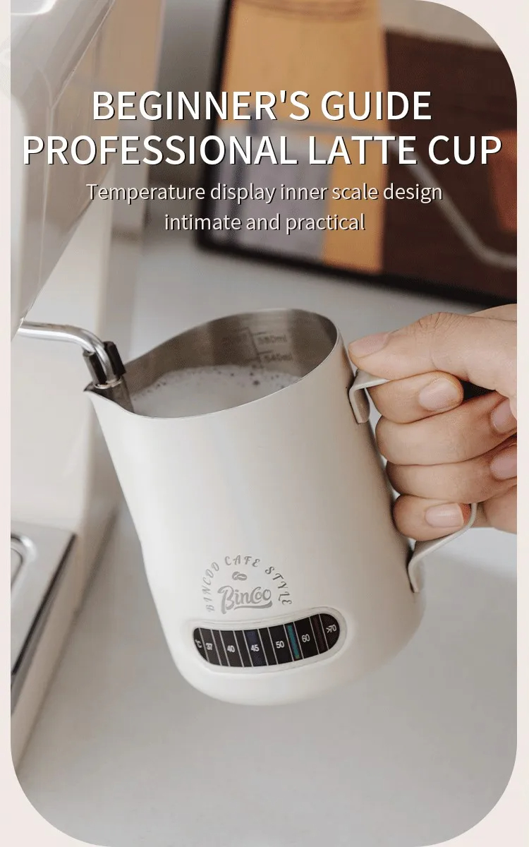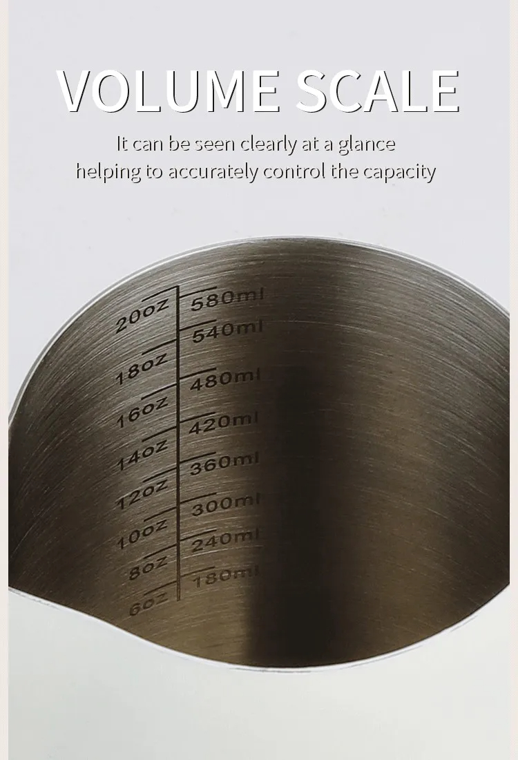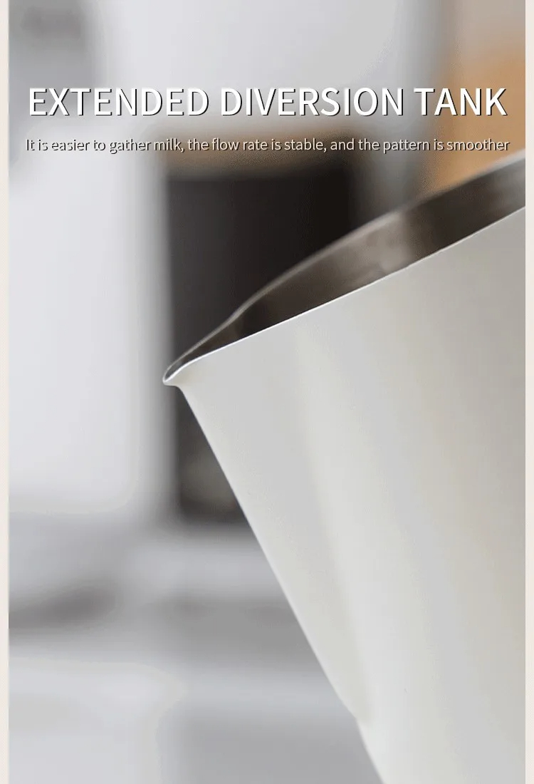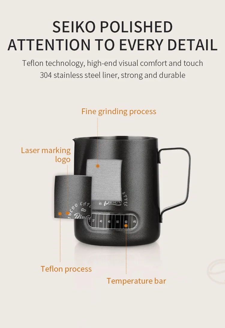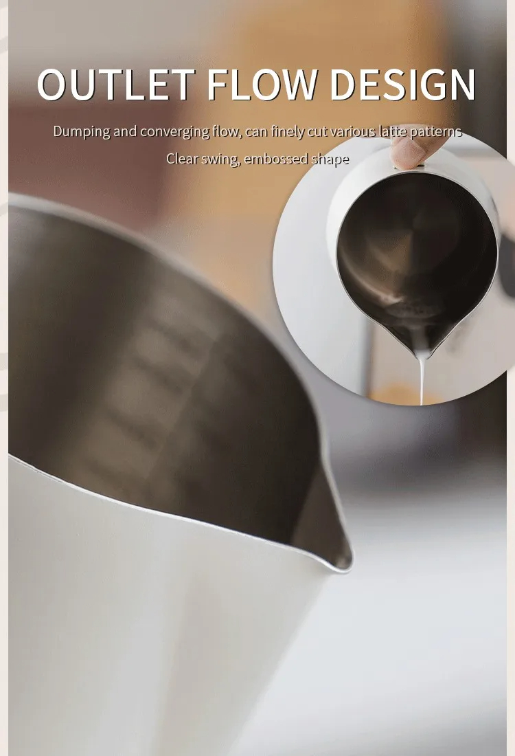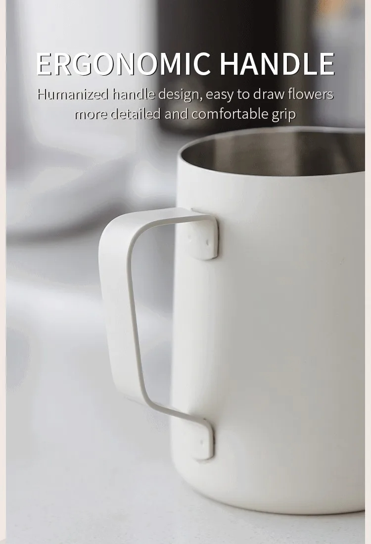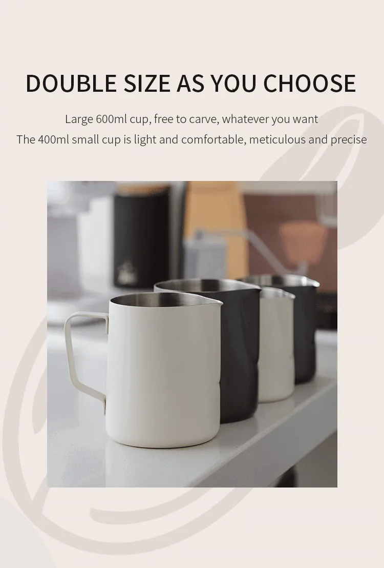 Built-in Temperature Display: No need for a separate thermometer—easily monitor milk temperature directly on the pitcher for perfect frothing every time. High-Quality Craftsmanship: Made with precision, featuring a Tefloncoating for a premium look and feel. Durable304 stainless steel interior ensures long-lasting performance. Ergonomic Handle: Designed for comfort, the ergonomic handle provides a secure and comfortable grip, making it easier to create detailed latte art. Streamlined Spout Design: The outlet's design allows for precise pouring and detailed latte art creation, offering clear patterns and consistent texture. Dual Size Options: Choose between the 600ml large pitcher for extensive designs or the 400ml small pitcher for delicate details, accommodating all your latte art needs.