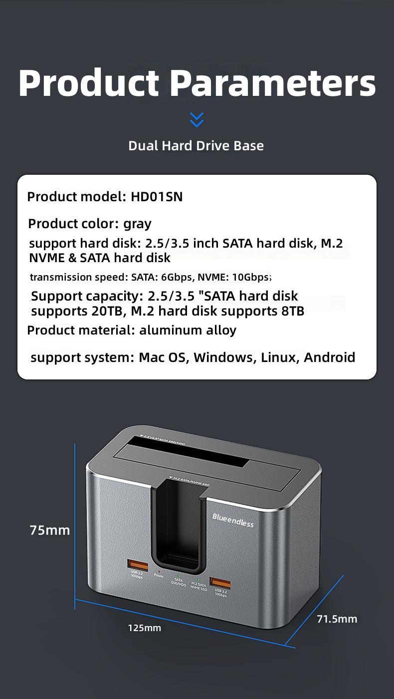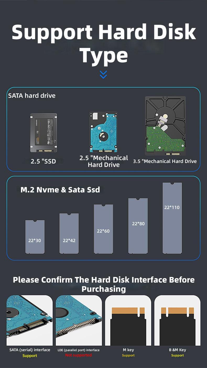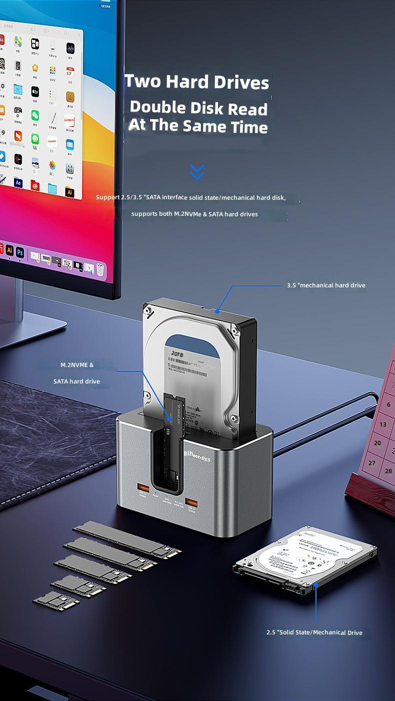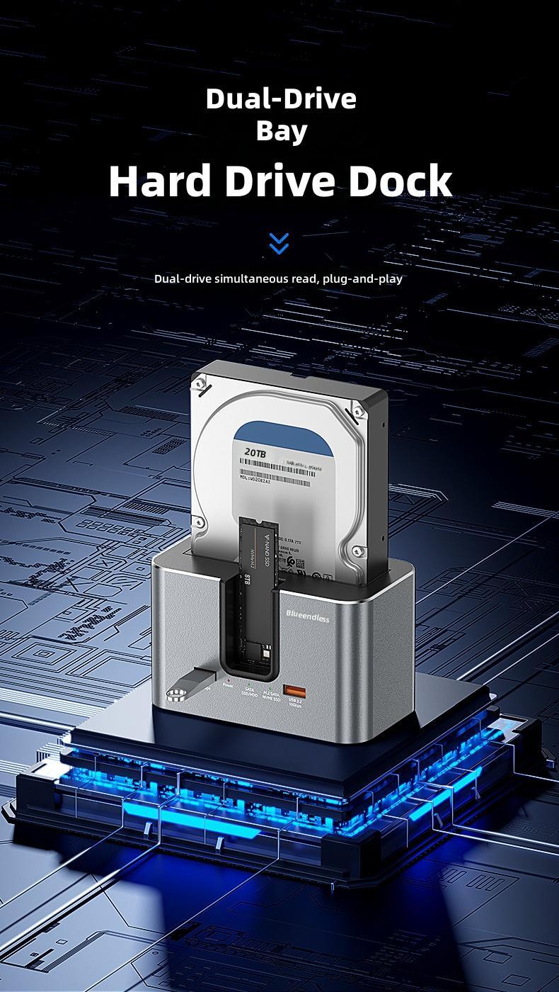 1. Dual-slot Design: Supports simultaneous reading of two hard drives, accommodating both 2.5'/3.5' SATA HDDs and M.2 NVMe/SATA SSDs.