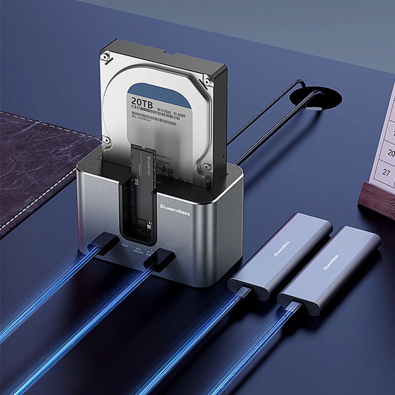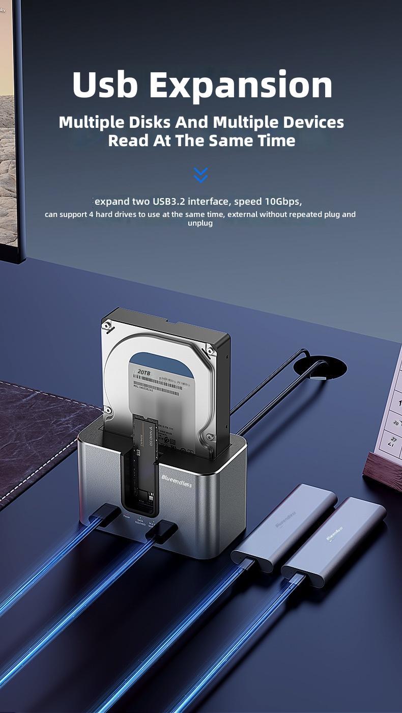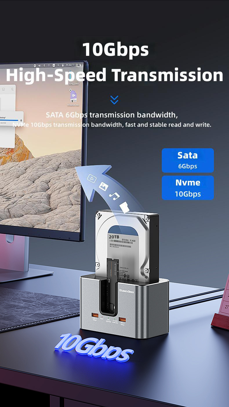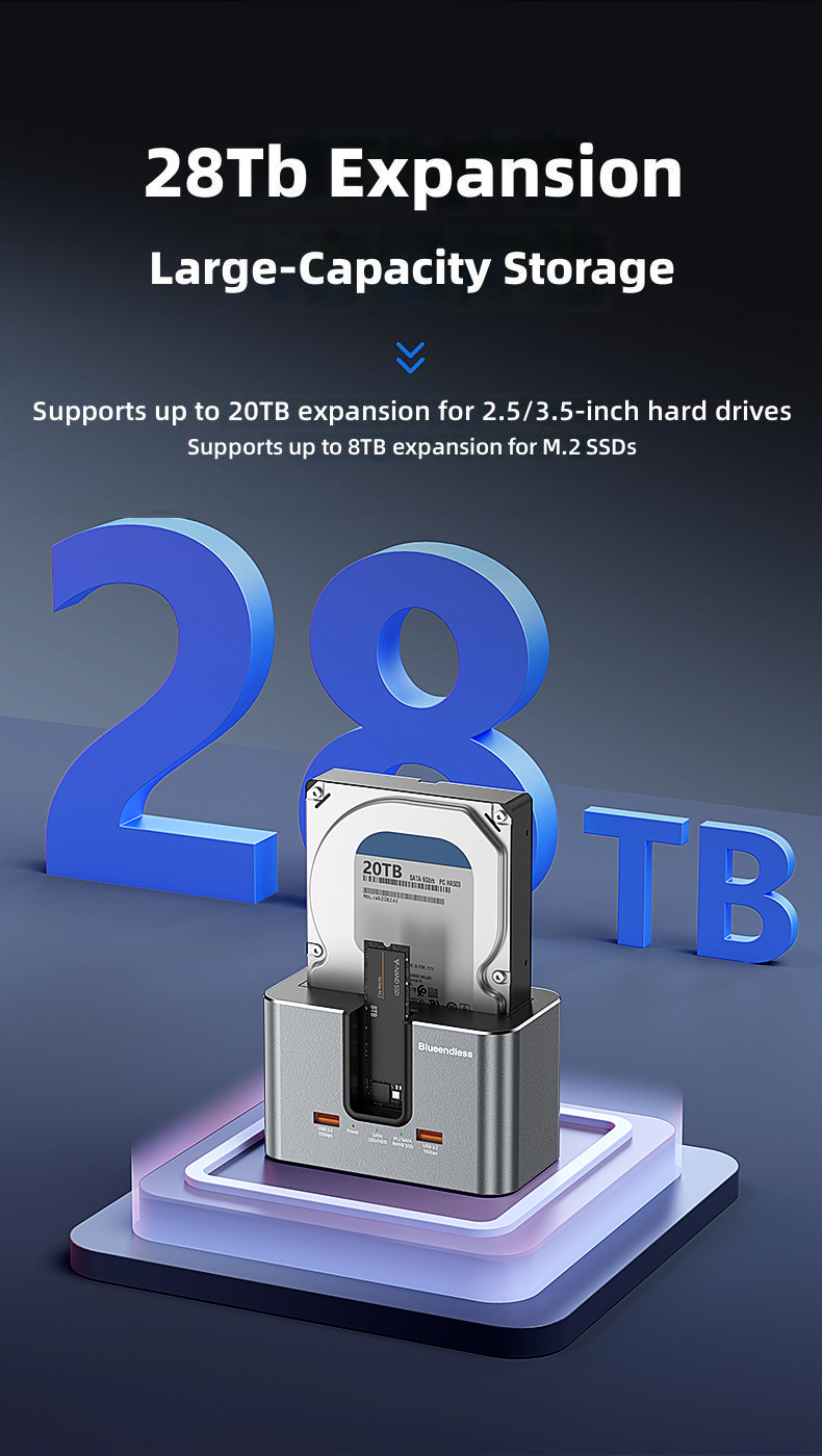 1. Dual-slot Design: Supports simultaneous reading of two hard drives, accommodating both 2.5'/3.5' SATA HDDs and M.2 NVMe/SATA SSDs.