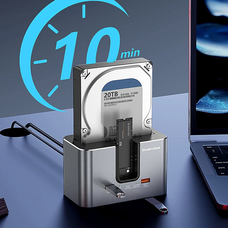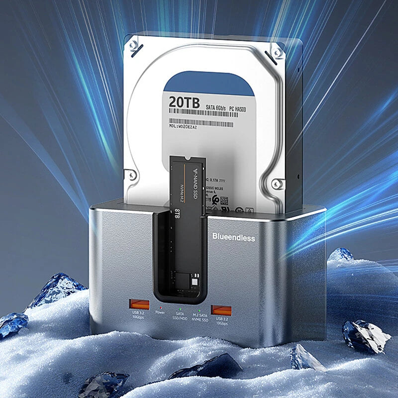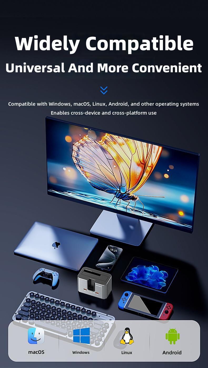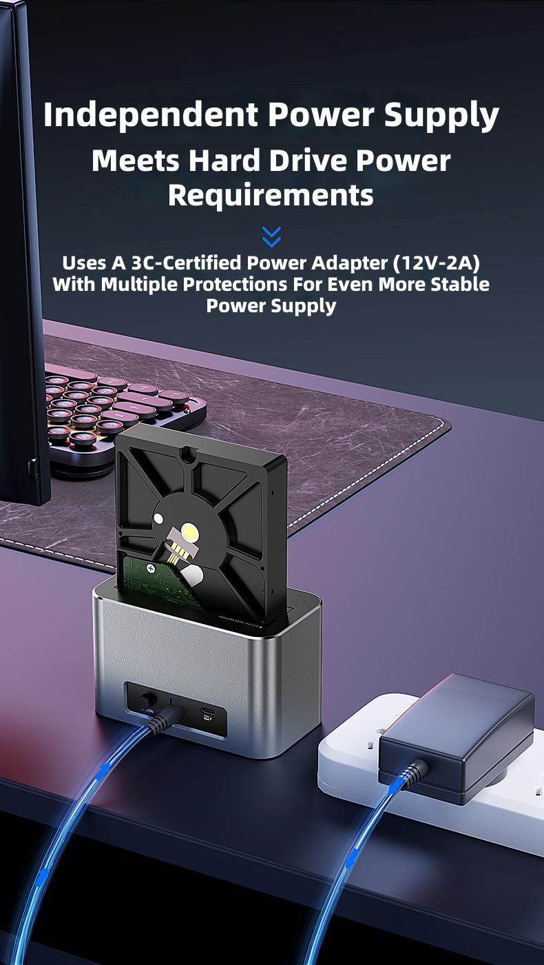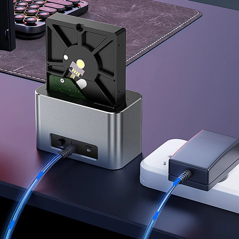 1. Dual-slot Design: Supports simultaneous reading of two hard drives, accommodating both 2.5'/3.5' SATA HDDs and M.2 NVMe/SATA SSDs.