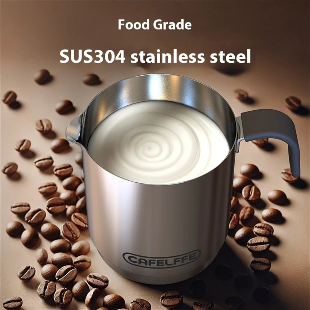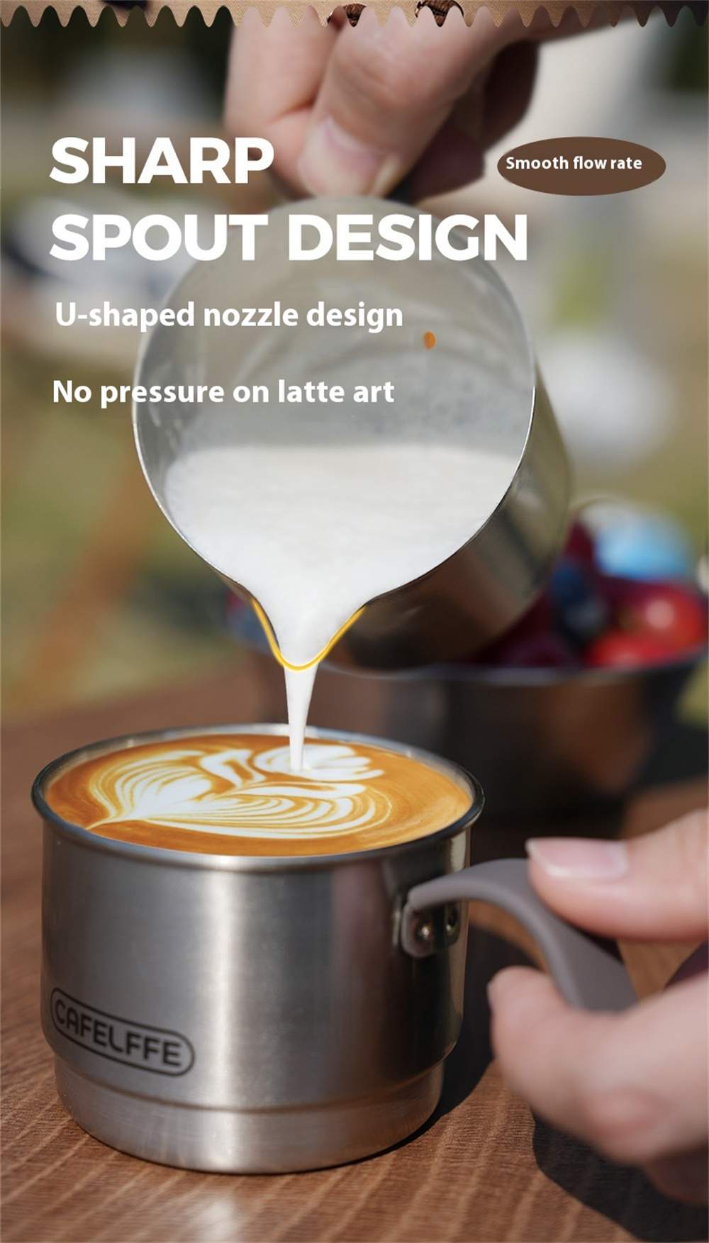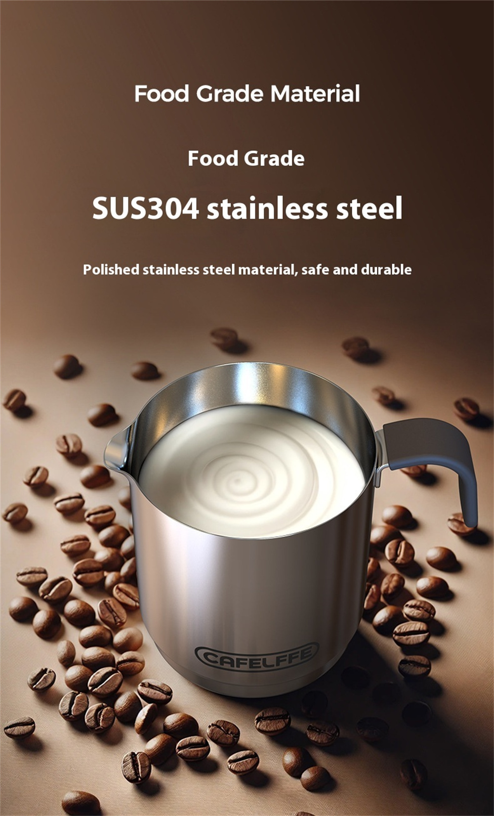 – Barista-Style Pouring Spout: Designed with a U-shaped spout, this frothing cup allows easy control for milk pouring and latte art. Whether you’re a beginner or a coffee lover, you can create beautiful designs with ease.