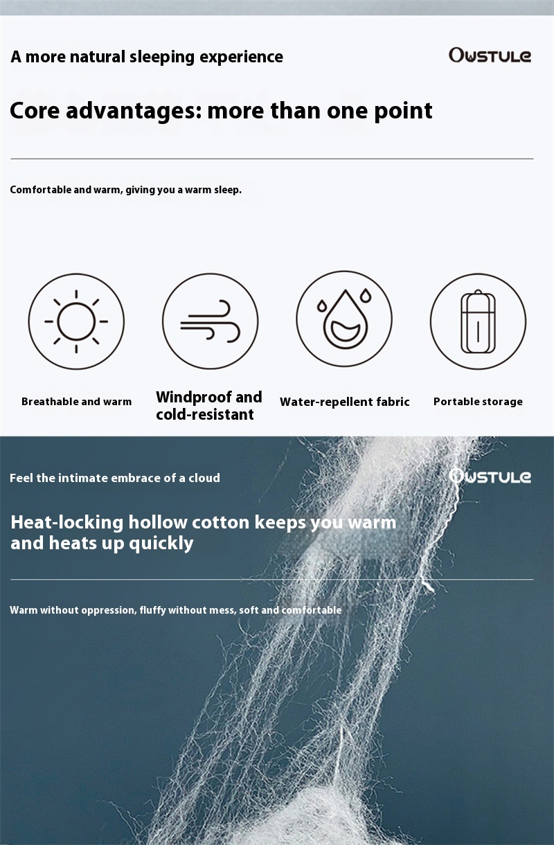 6.Multi-seasonal Use: In addition to winter use, this sleeping bag is also suitable for camping and indoor resting in other seasons. It can be adjusted according to the temperature, providing appropriate warmth and comfort.