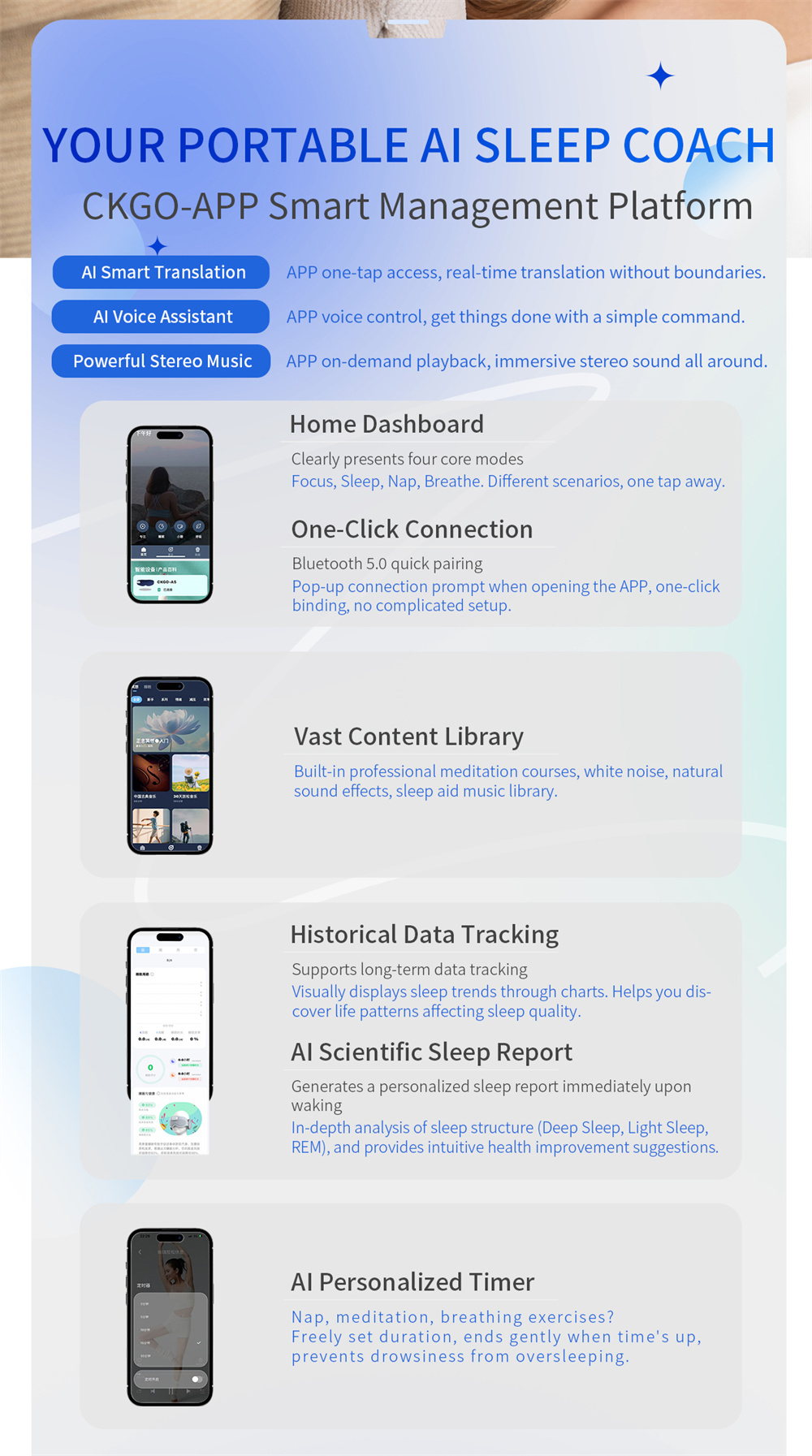 - AI sleep monitoring with APP: Built-in biometric sensor tracks sleep stages and sends clear, personalized sleep reports via the companion app. Learn patterns, set goals, and get smart suggestions for better rest.