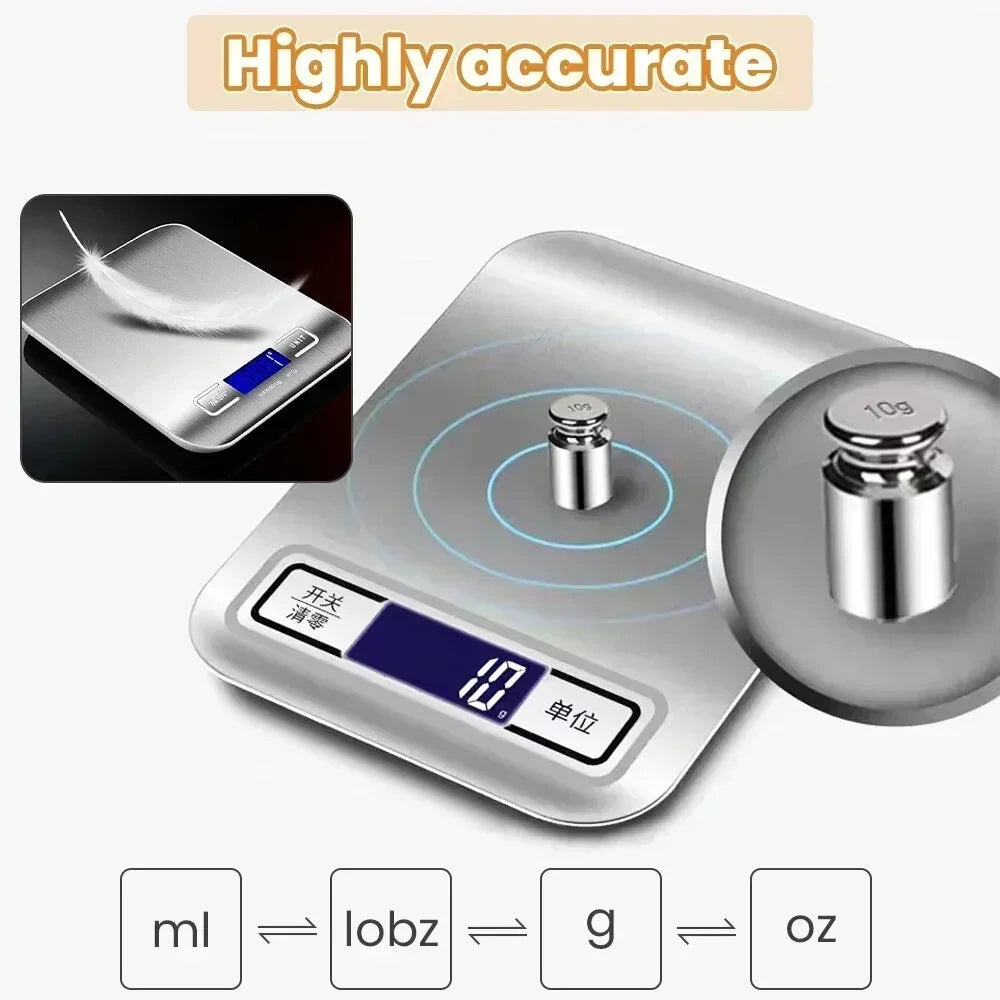 - This digital scale can quickly and accurately measure ingredients, postage, drugs, etc., with a weight range of up to 10 kilogramme. Calculate in units of g,Ib:OZ,ml,fl:oz, and switch between units at the push of a button without re-measurement.