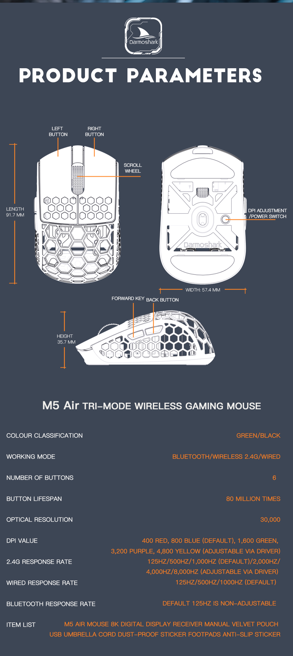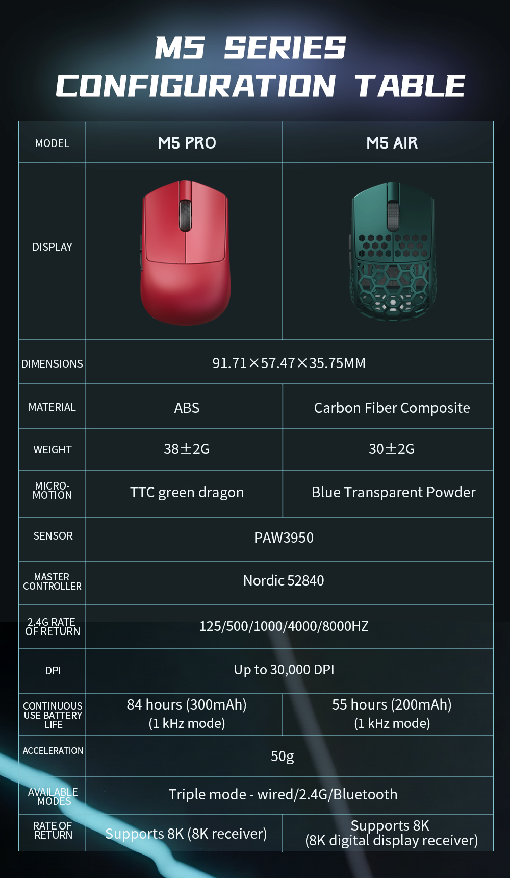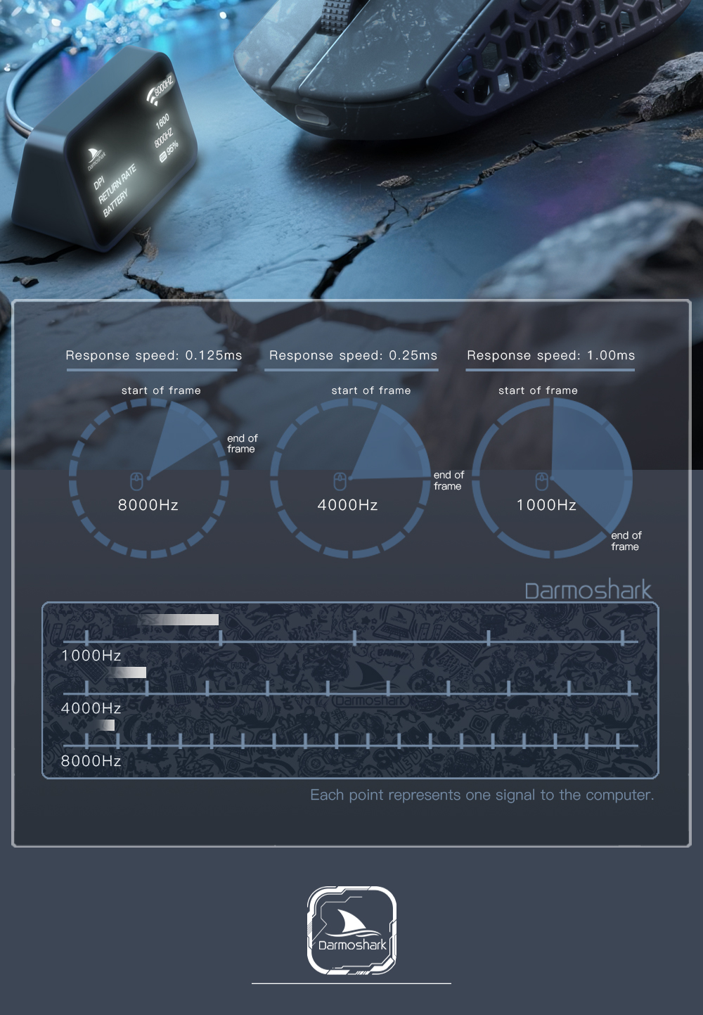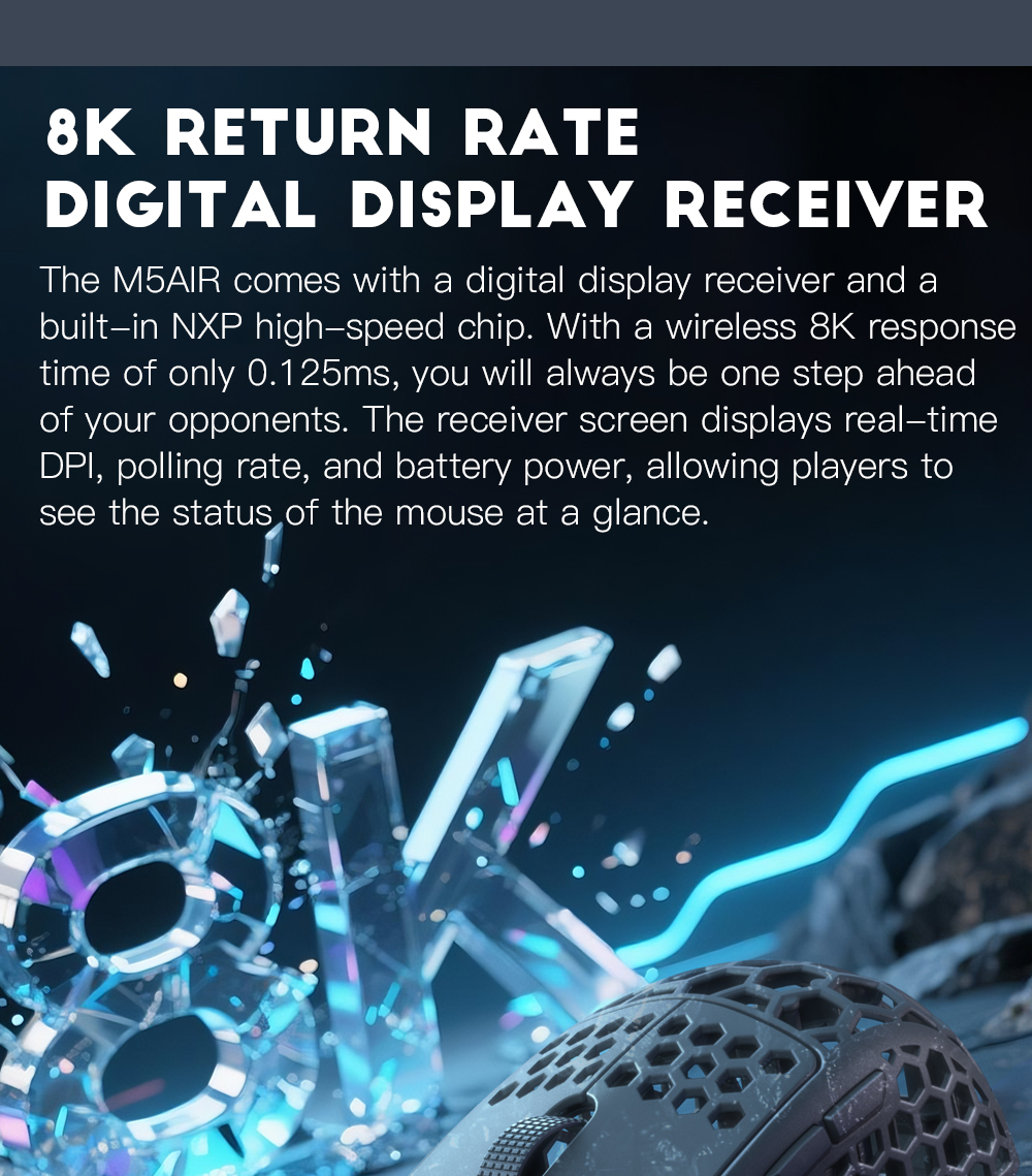 4. 8K Return Rate Technology: Equipped with an 8K digital display receiver providing real-time polling rate, DPI, and battery stats.