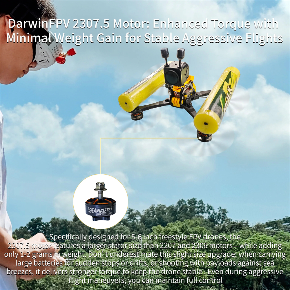 - DarwinFPV 2307.5 Motor: Enhanced Torque with Minimal Weight Gain for Stable Aggressive Flights