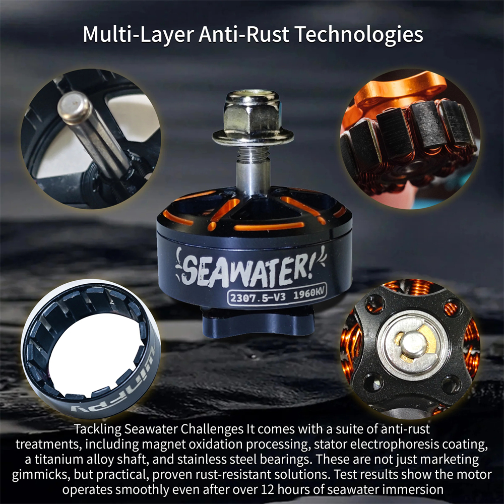 In the FPV drone industry, the 'SeaWater' series stands as the only motor line that delivers reliable seawater resistance—a result of our years of meticulous R&D and continuous refinement. While we don’t claim these motors are 'indestructible,' they undoubtedly let you fly with greater peace of mind in marine or water-adjacent scenarios. Moreover, they significantly extend the motor’s overall service life.