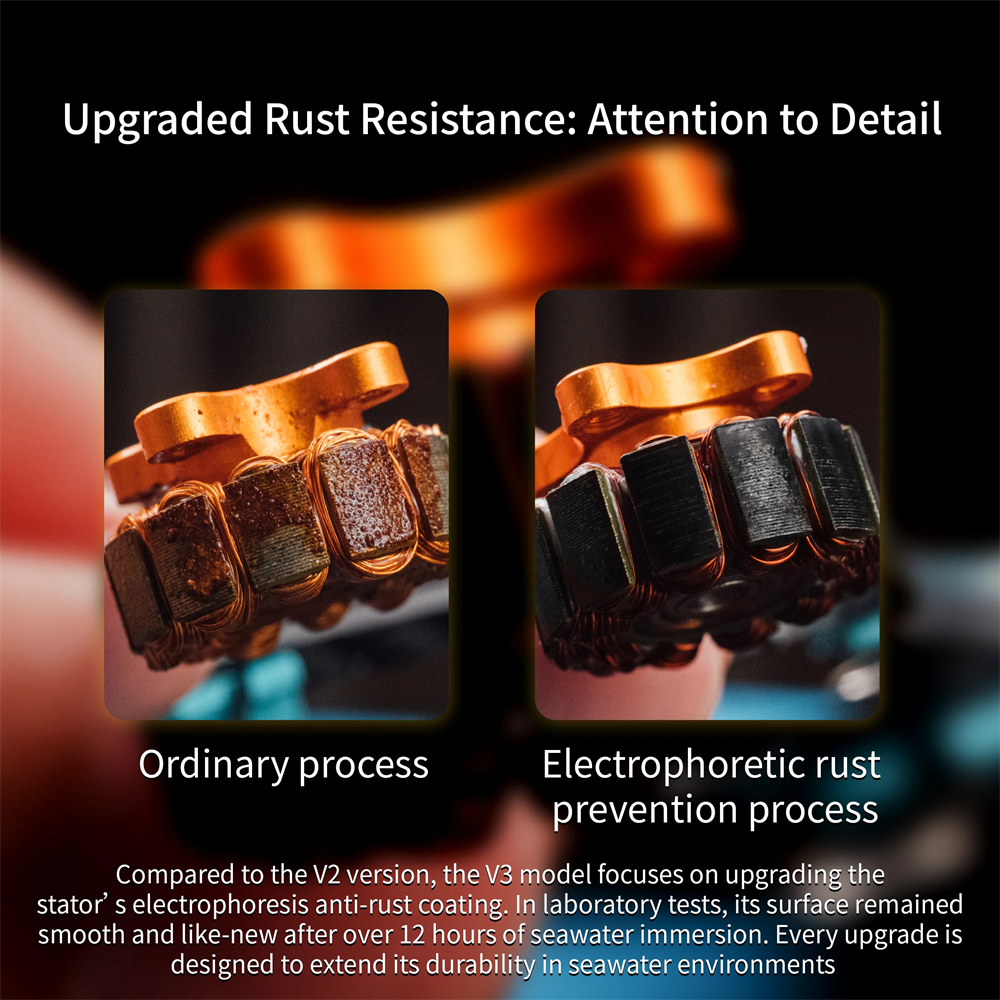 Compared to the V2 version, the V3 model focuses on upgrading the stator’s electrophoresis anti-rust coating. In laboratory tests, its surface remained smooth and like-new after over 12 hours of seawater immersion. Every upgrade is designed to extend its durability in seawater environments.