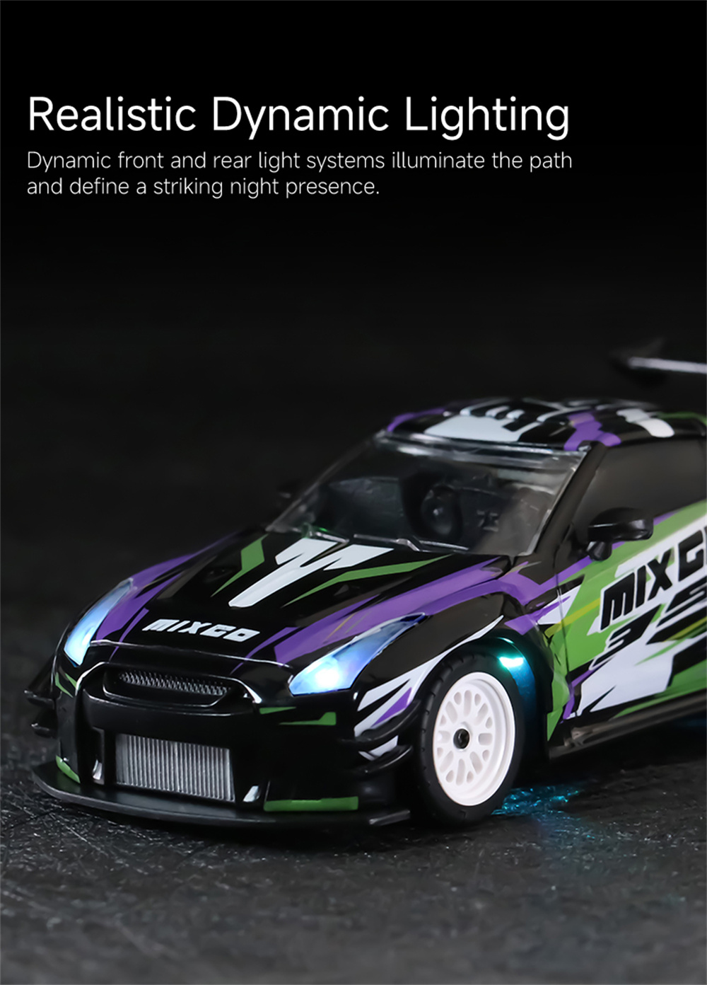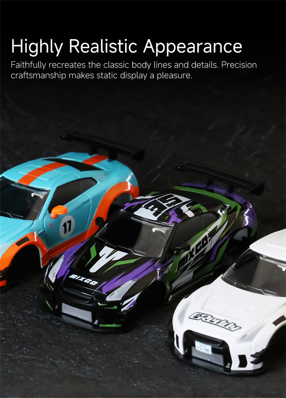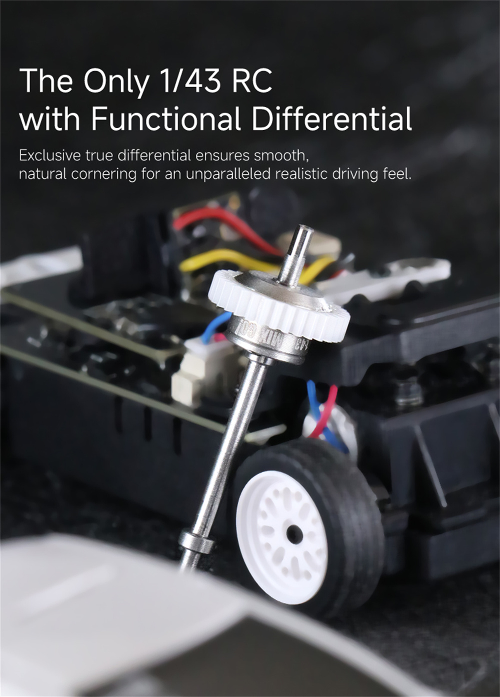 The only 1/43 RC with functional differential(optional),exclusive true differential ensures smooth,natural cornering for an unparalleled realistic driving feel.