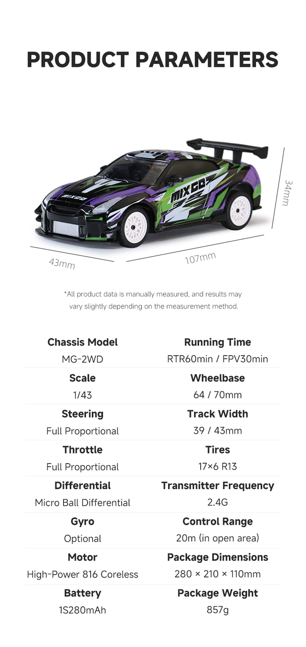 Car Size:107*43*34mm Wheelbase:64/70mm Track Width:39/43mm Tires:17*6mm R13 Box Size:280*210*110mm |