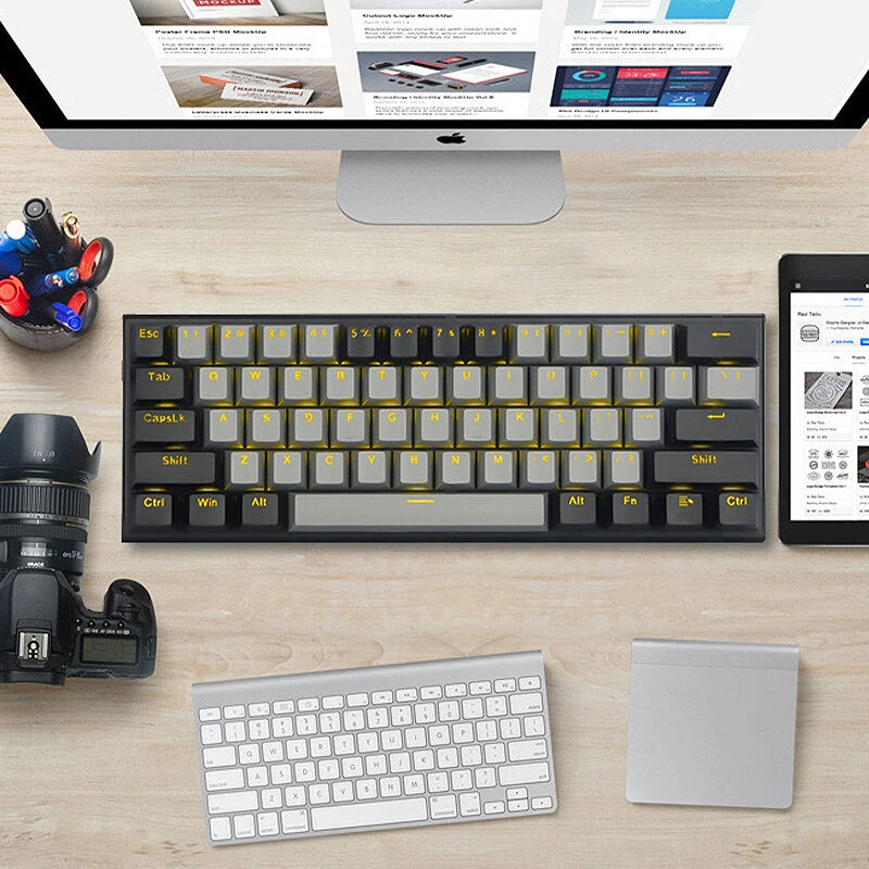 1. Portable 60% Percent Mechanical Keyboard: This is a 61 keys compact mini mechanical keyboard with metal panel and type-c removable connecting line, it's good for all environment, business travel games office home use, without Numpad, more practical for Gamers and Typist, give more space to your desktop.2. Customizable keycaps: The keyboard features PBT&ABS two-color injection molding keycaps for a comfortable typing experience.