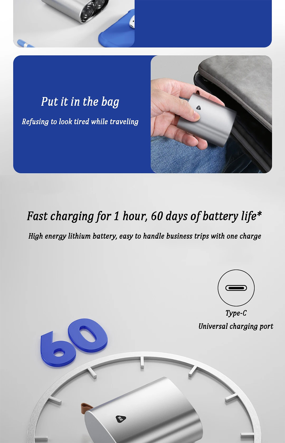 - Battery Efficiency: A full charge takes only 1 hour and provides up to 60 days of regular use (1 minute per day), making it an excellent choice for those who travel frequently or prefer minimal charging interruptions. This efficient charging feature makes the shaver exceptionally convenient and reliable.