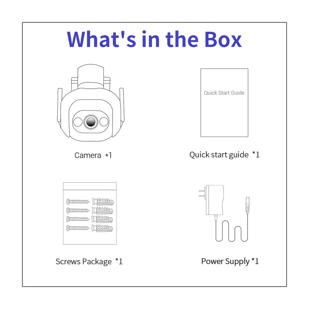 H.265 HD 4MP, resolution 2560*1440, 10X digital zoomSupport Blue & Red lighting alarm & Sound alarm,and can select warning areaSupport two-way audioSupport motion detection & humanoid detection & tracking, APP alarm pushThe camera body can be rotated by 355°/90°Intelligent dual light source night vision, 8 infrared lamps, 4 white LED lamps, 20m detection distanceSupport cloud storage, up to 128G memory cardIP66 waterproofAPP: iCam365
