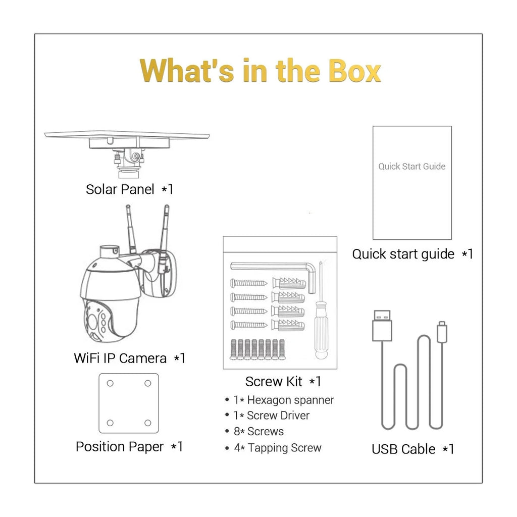 | Package List | Solar Panel*1,WIFI Camera*1,Screw Kit*1,USB Charging Cable*1,User Manual*1, Position Paper*1, | |