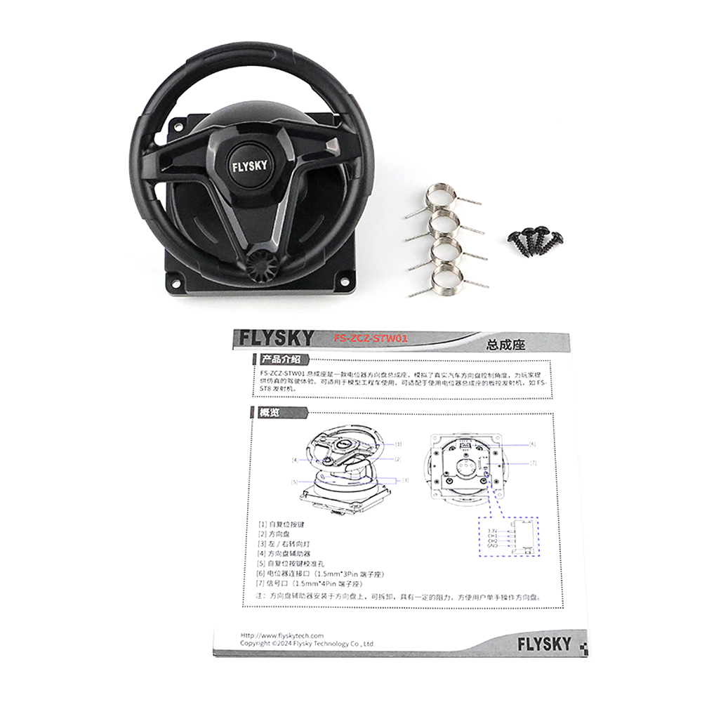 FS-ZCZ-STW01 is a potentiometer steering wheel gimbal that simulates the real steering wheel control angle of a car to provide players with a simulated driving experience. It can be used for model engineering vehicles, and can be adapted to air transmitters that use the potentiometer gimbal, such as the FS-ST8 transmitter.