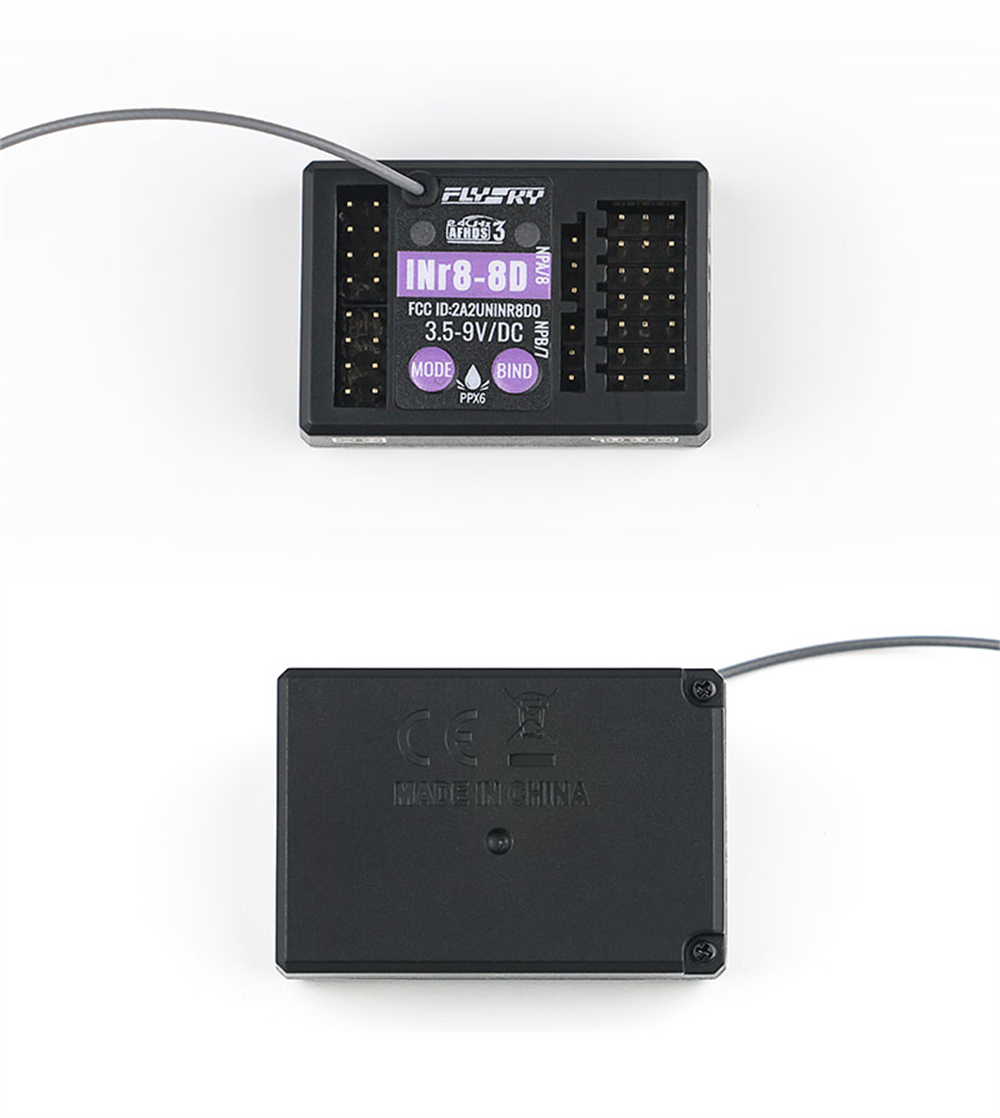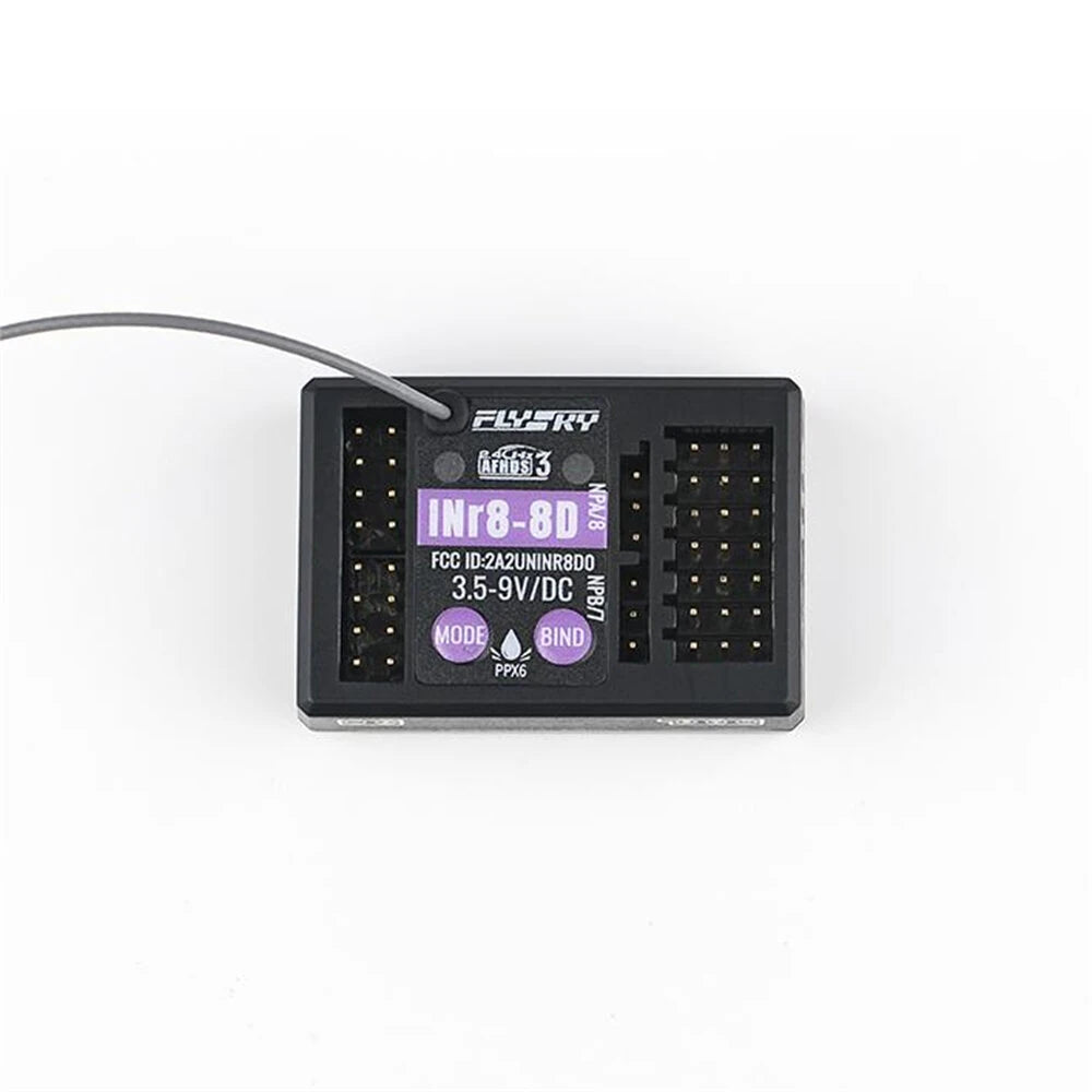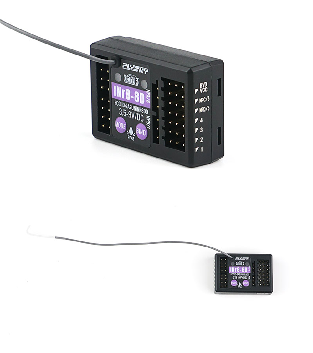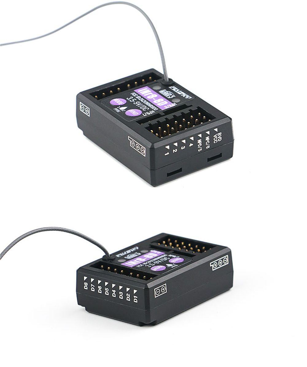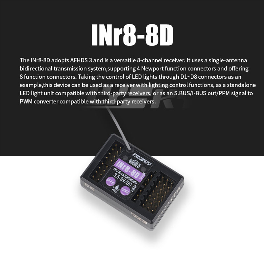 The INr8-8D adopts AFHDS 3 and is a versatile 8-channel receiver. It uses a single-antenna bidirectional transmission system,supporting 4 Newport function connectors and offering 8 function connectors.Taking the control of LED lights through D1~D8 connectors as an example,this device can be used as a receiver with lighting control functions, as a standalone LED light unit compatible with third-party receivers, or as an S.BUS/i-BUS out/PPM signal to PWM converter compatible with third-party receivers.