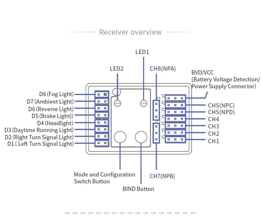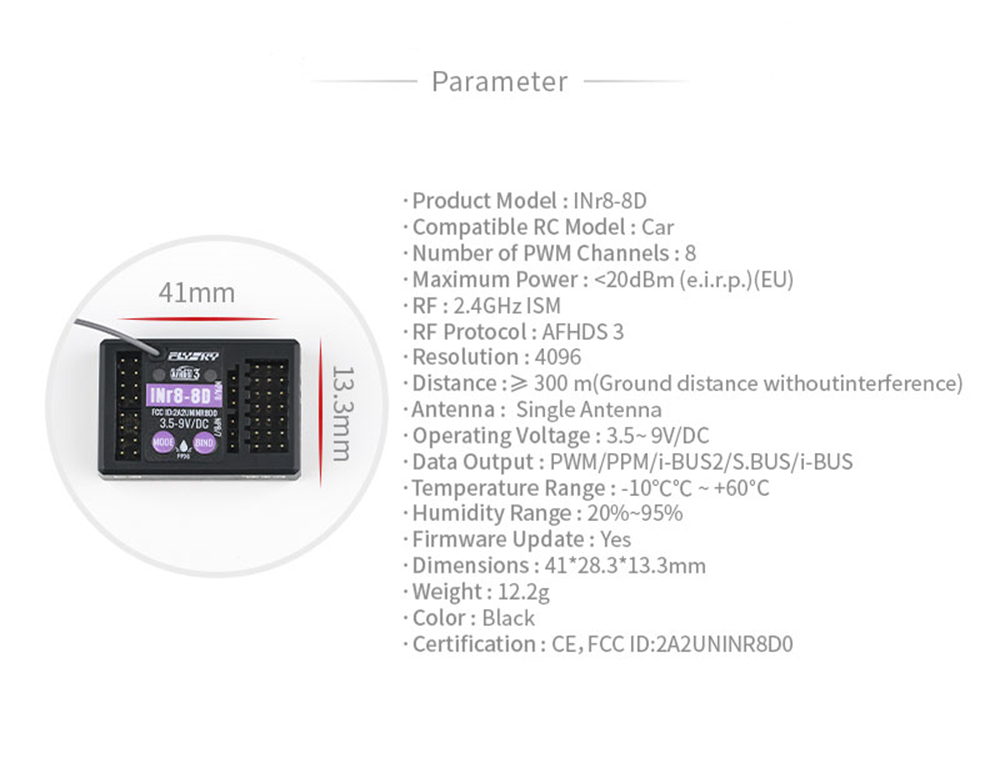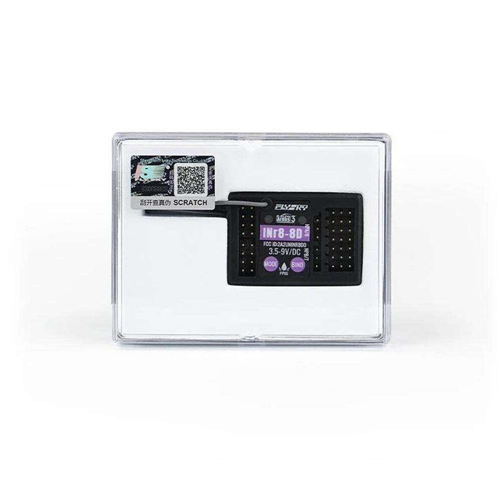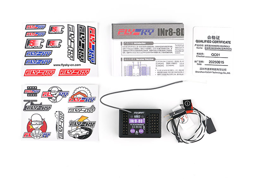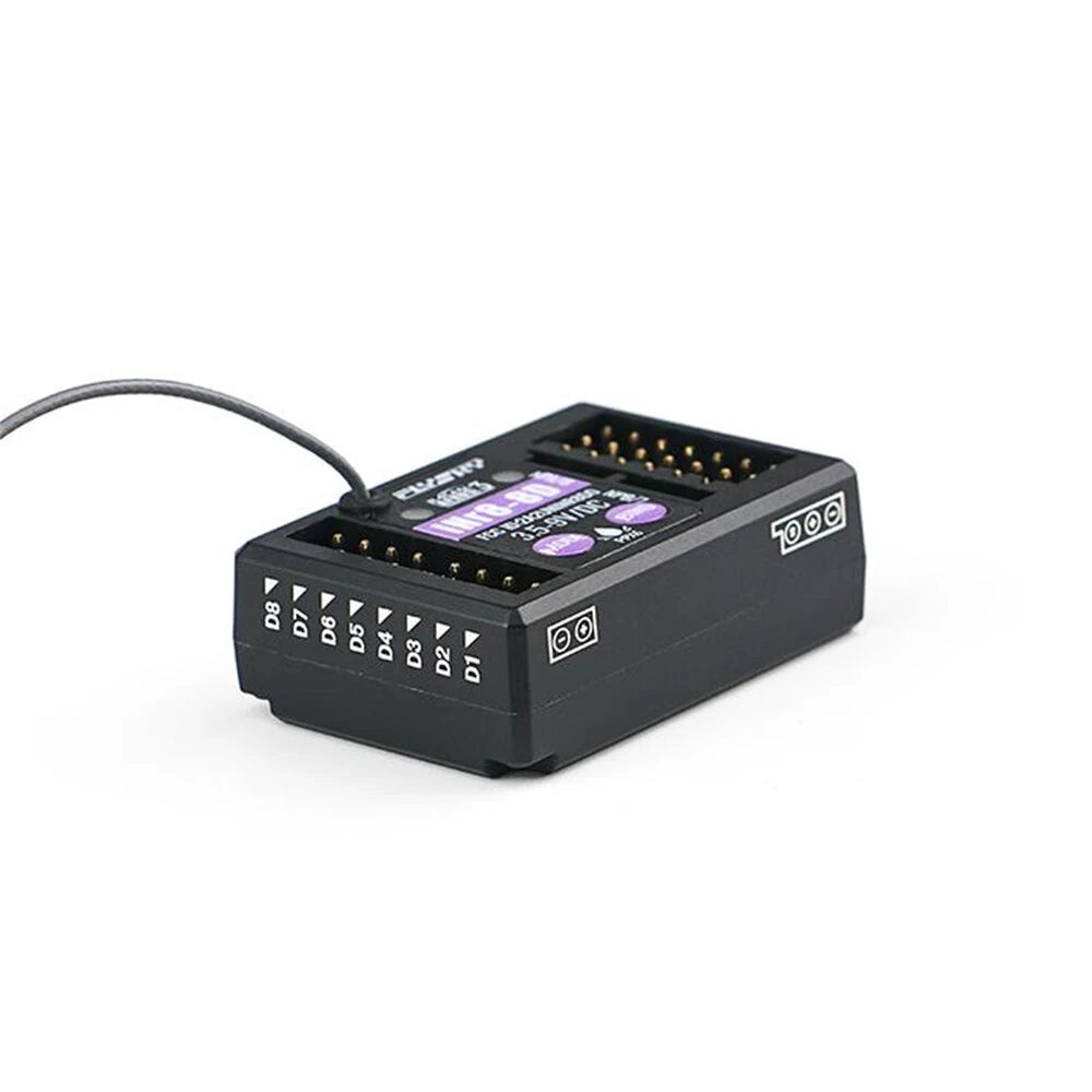 The INr8-8D adopts AFHDS 3 and is a versatile 8-channel receiver. It uses a single-antenna bidirectional transmission system,supporting 4 Newport function connectors and offering 8 function connectors.Taking the control of LED lights through D1~D8 connectors as an example,this device can be used as a receiver with lighting control functions, as a standalone LED light unit compatible with third-party receivers, or as an S.BUS/i-BUS out/PPM signal to PWM converter compatible with third-party receivers.
