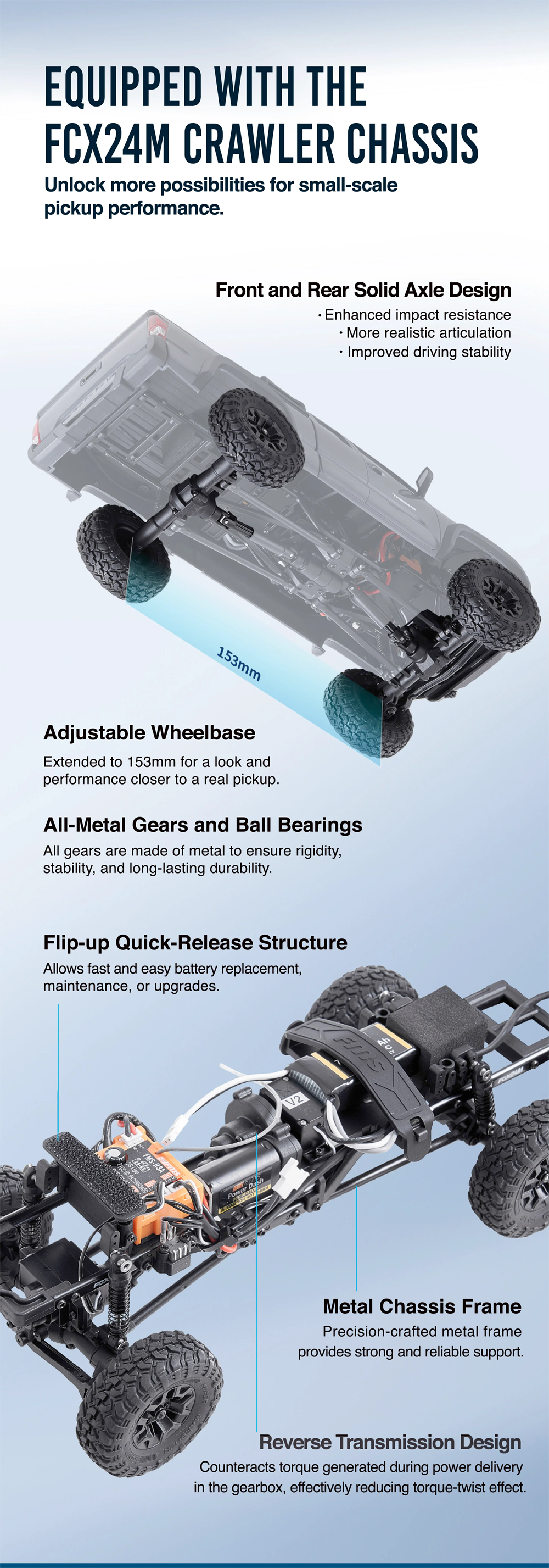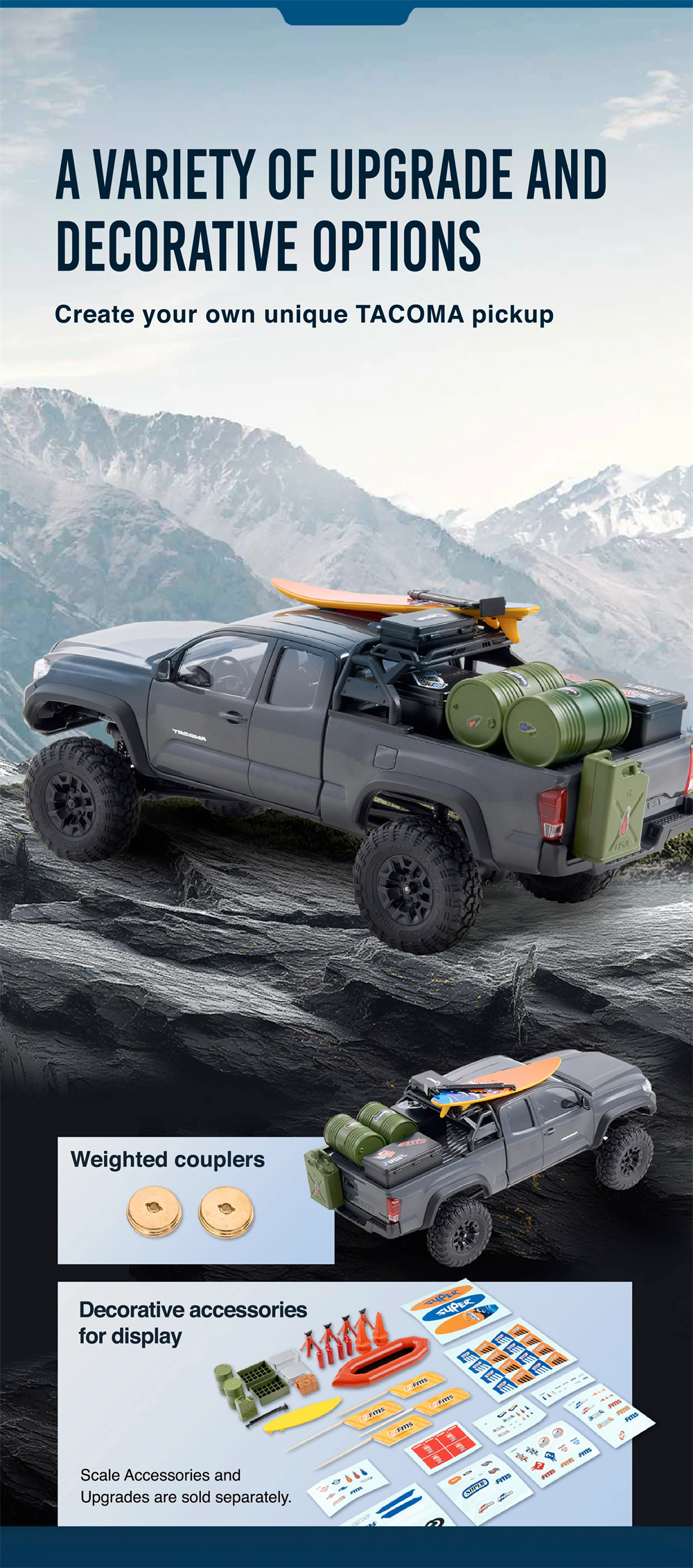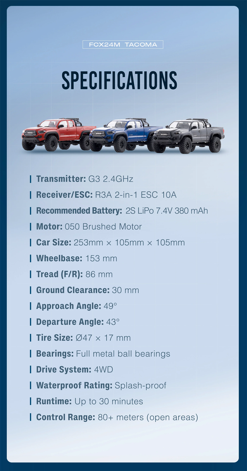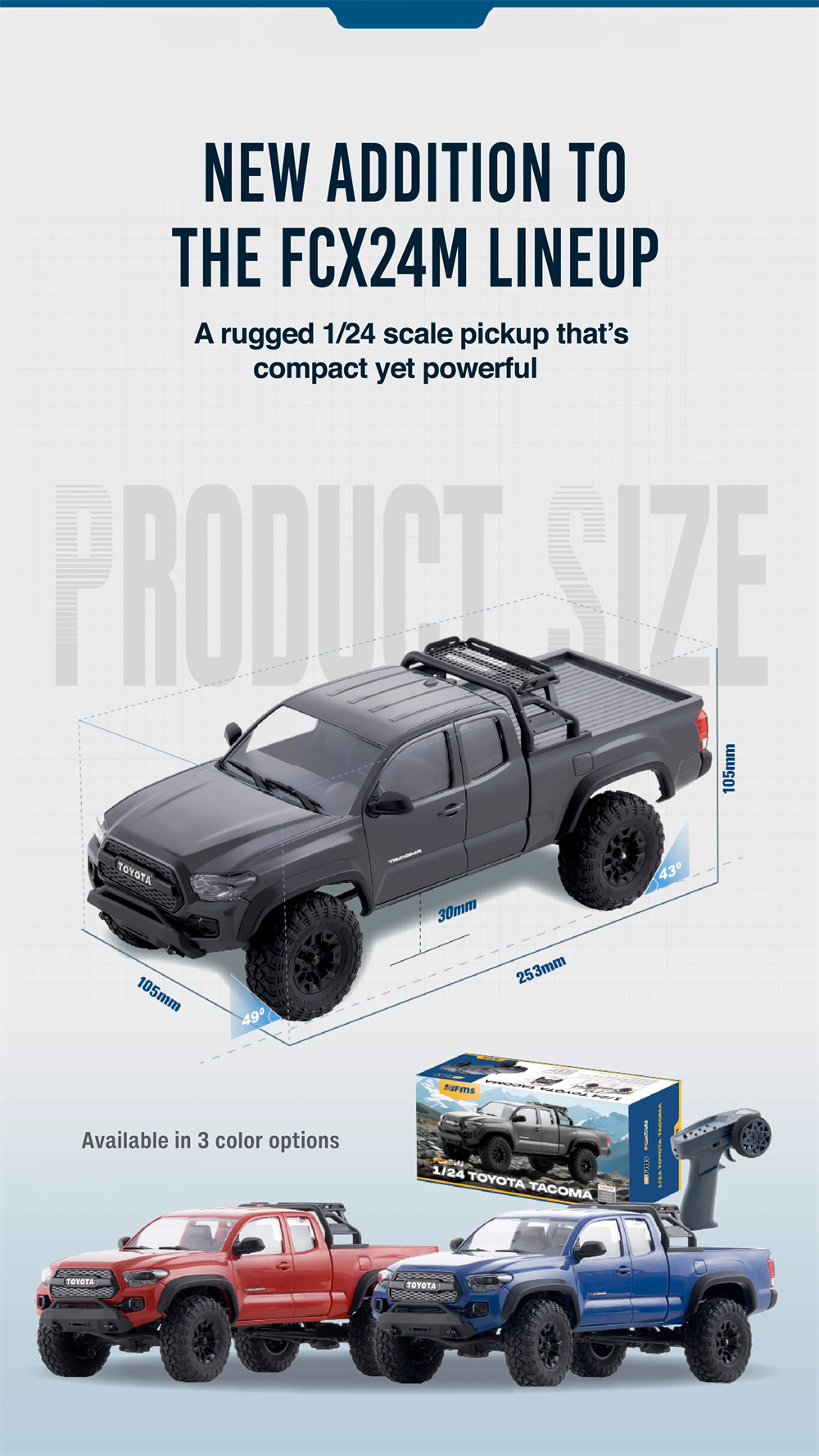 Built on the next-generation FCX24M chassis, the Tacoma features a 153mm (6.02') extended wheelbase, ladder-frame construction, and solid axles for increased durability and torque control. The all-new off-road tires deliver excellent grip and ground clearance, giving this micro-crawler big-truck performance.