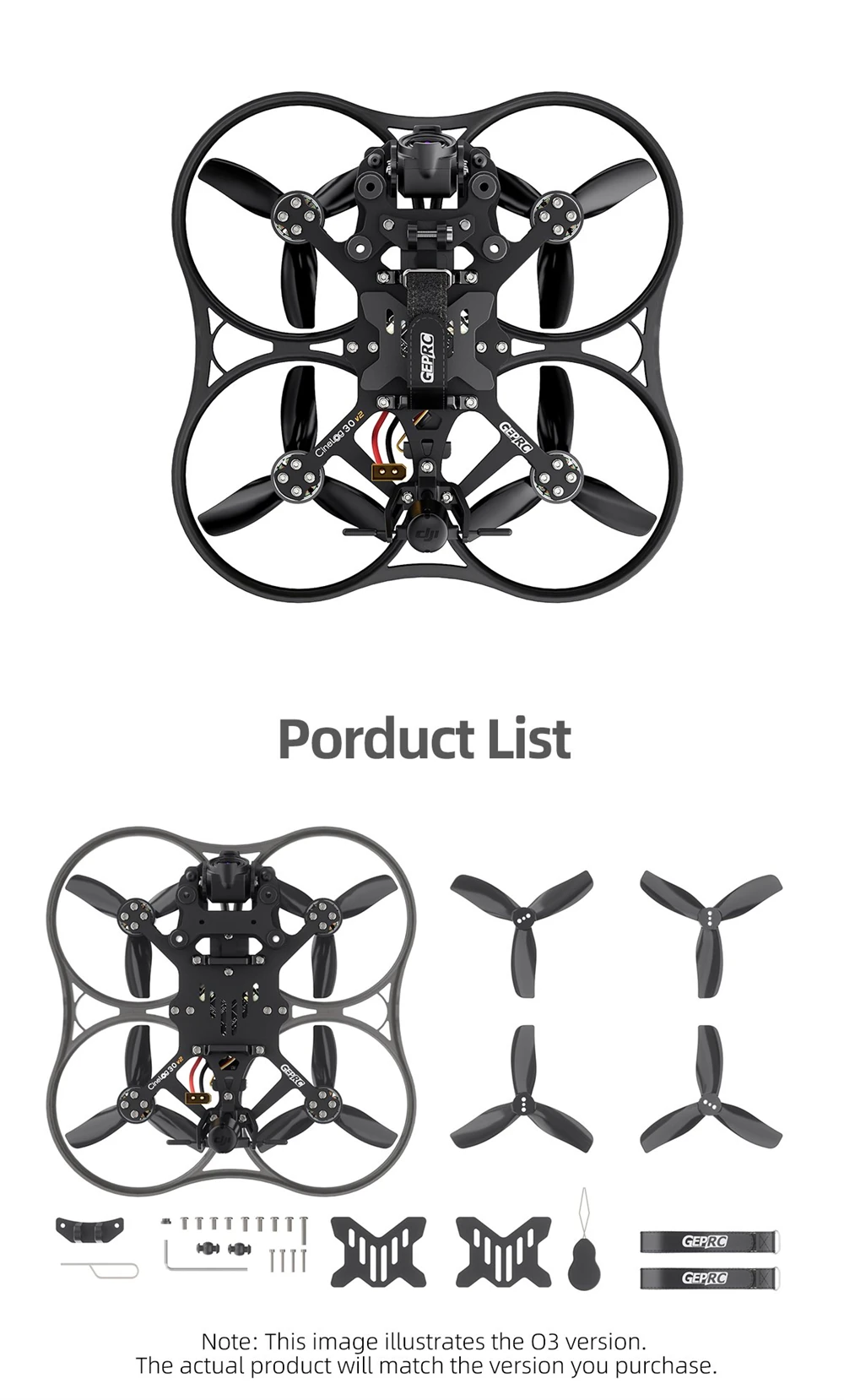 1 x Cinelog30 V2 Quadcopter1 x HQprop DT76mmx3 V2 propeller (pack)2 x 15*150mm battery straps1 x L-shaped screwdriver 1.5mm1 x Spare screw pack2 x Battery anti-slip pads1 x Damping ball puncher1 x Frenquency pairing ejector pin1 x Naked GoPro mountSpare screws pack includes4 x M2*5mm Pan-Head screws1 x Swage nut4 x M2*4mm Pan-Head screws4 x 1.6*10mm screws2 x DJI O3 damping balls