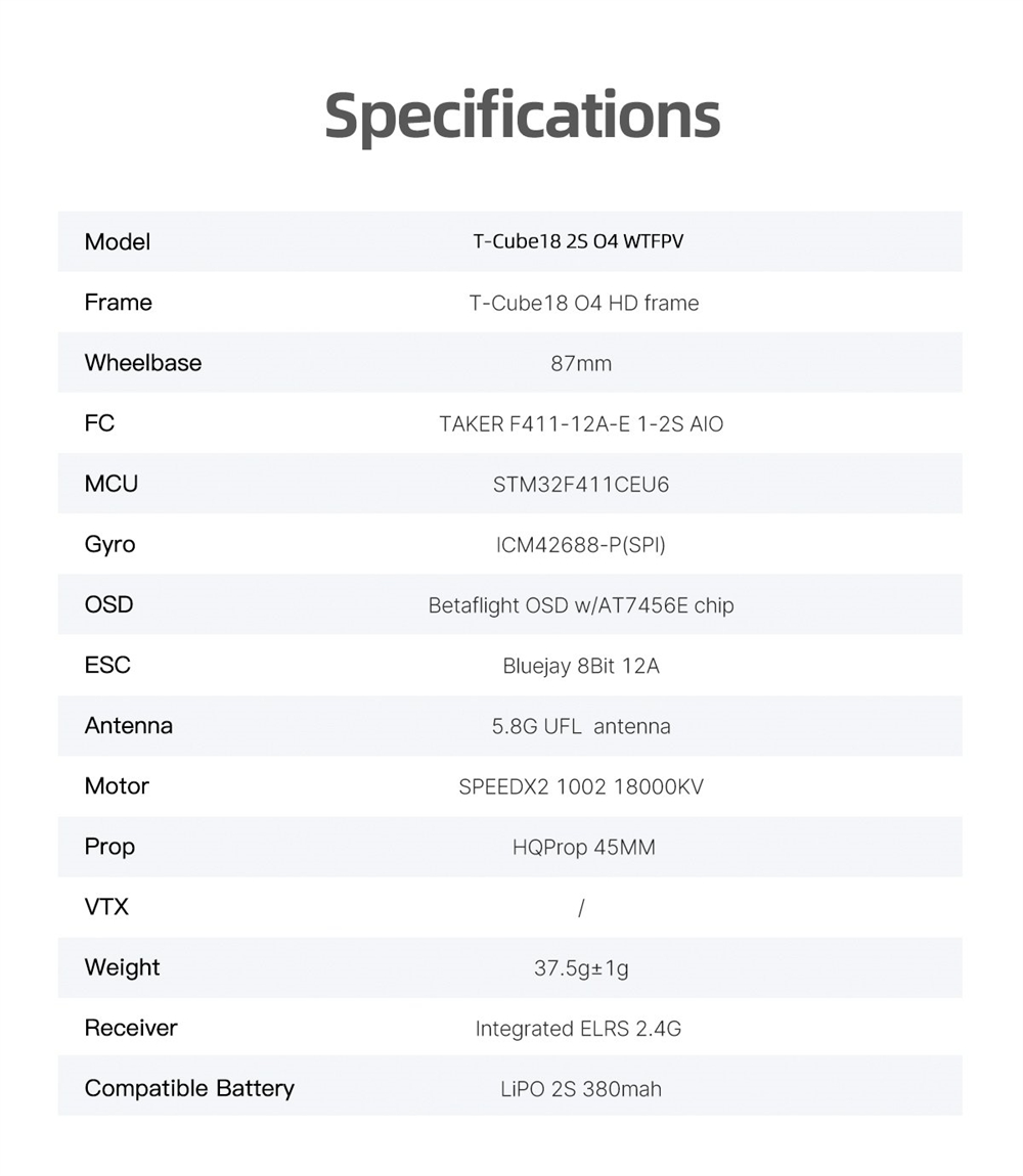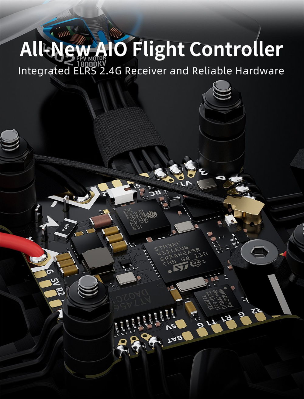 - Features the TAKER F411-12A-E 1-2S AIO flight controller with a built-in ELRS 2.4G receiver, specifically crafted for small FPV drones.