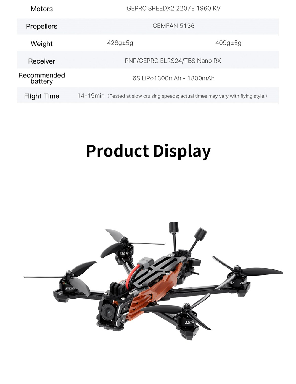 - GEPRC SPEEDX2 E-series motors for smooth, powerful performance.