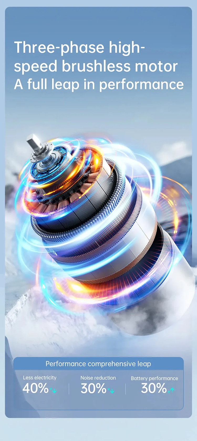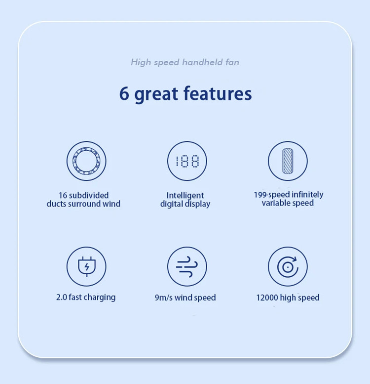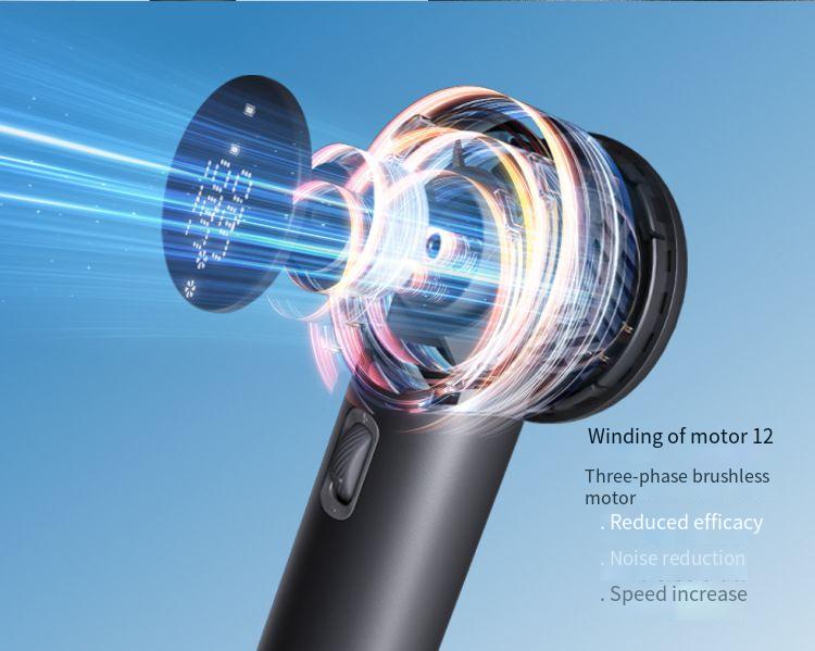 1.【Brushless Motor - Super Power】The combination of a three-phase brushless motor and a 3500mAh battery significantly improves the wind speed, power, and endurance. The maximum wind speed can reach 9m/s. The highest rotation speed of the handheld fan is three times that of a regular personal fan, reaching up to 15000 RPM. It can cool for 1-12 hours on a single charge.