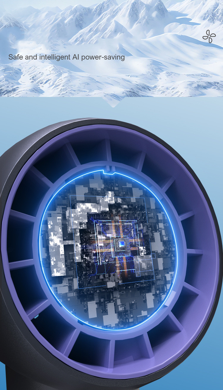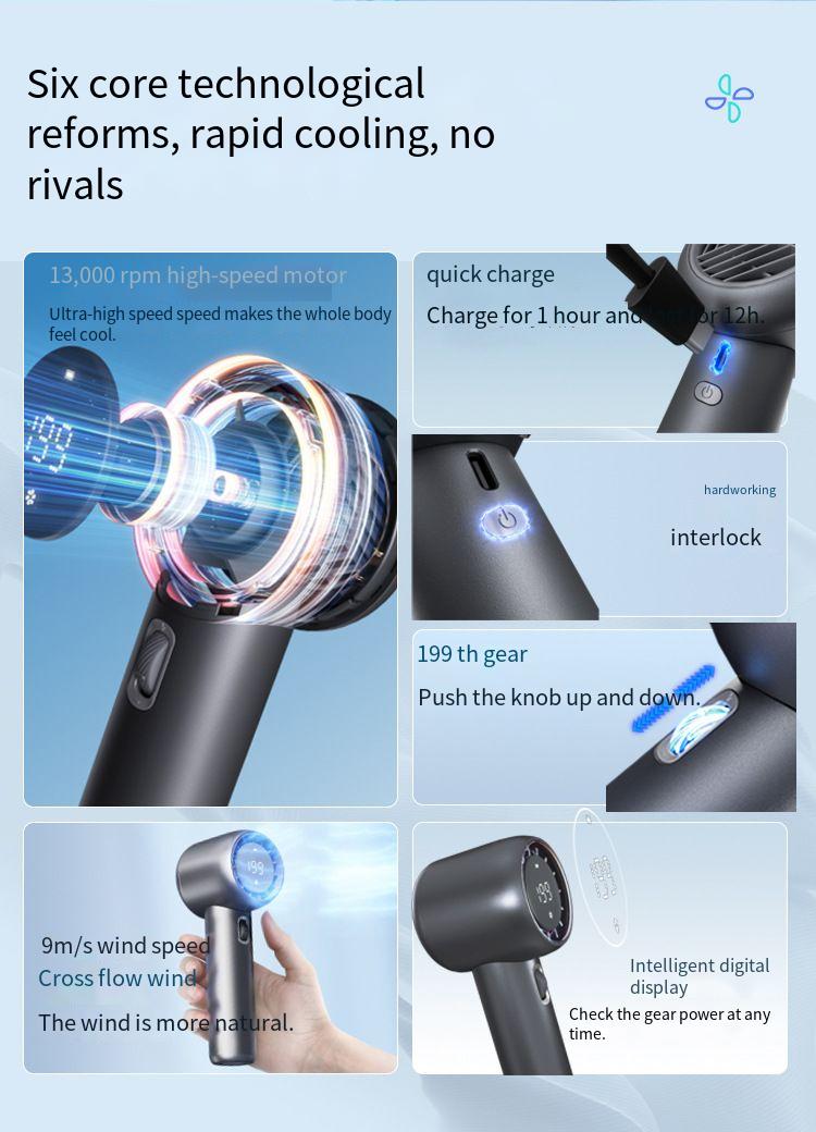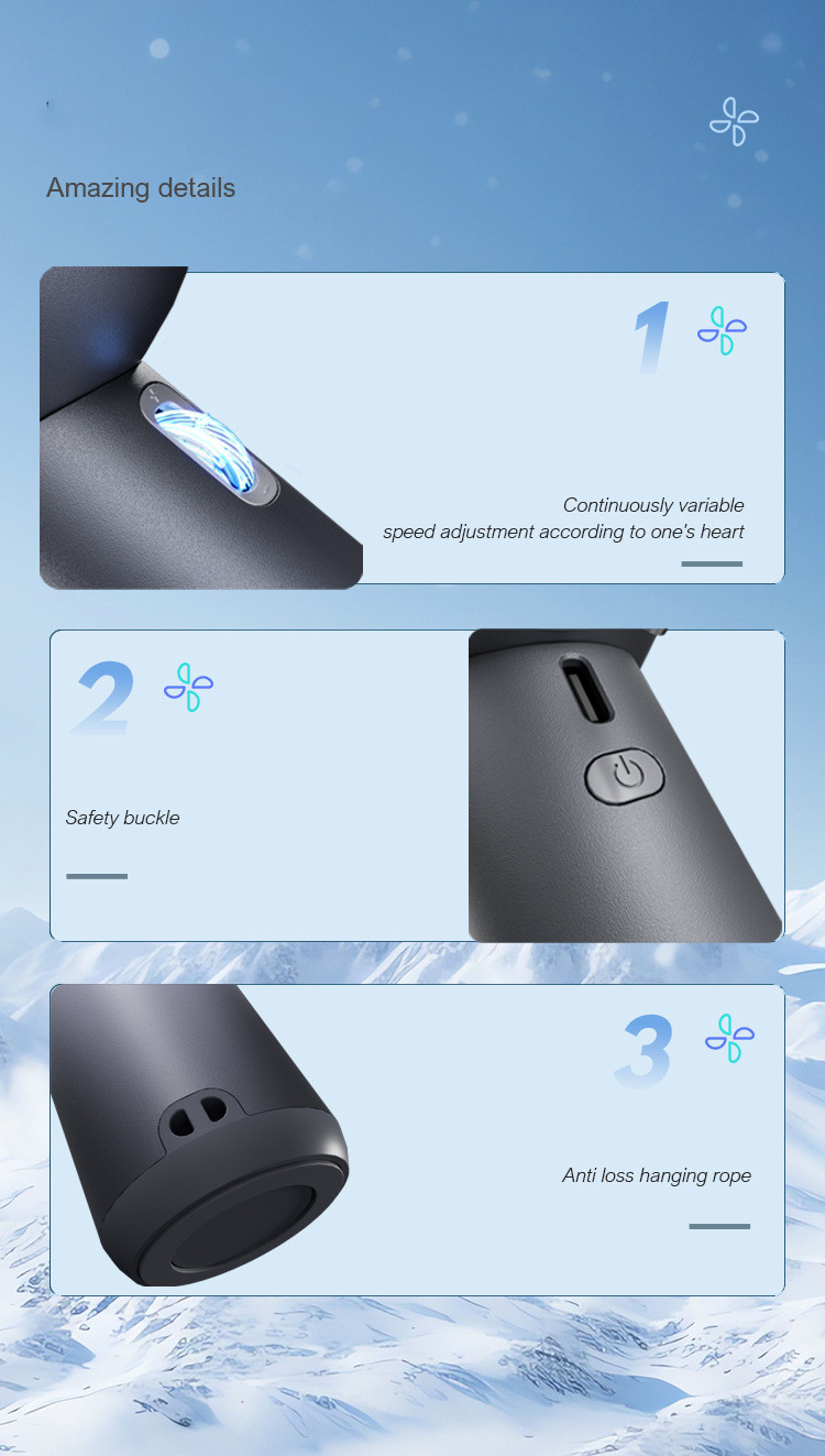 3.【Technology Design - Cold Wind Delivery】 The personal fan utilizes a turbine structure with a powerful motor to quickly compress and cool down the hot air that is sucked in, turning it into the cold air that blows out. This can quickly cool you down in hot weather.