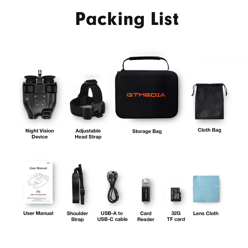 1 x User Manual1 x Storage Bag1 x Cloth Bag1 x Shoulder Strap1 x Lens Cloth1 x Night Vision Device1 x 32G Memory Card1 x Card Reader1 x Adjustable Head Strap