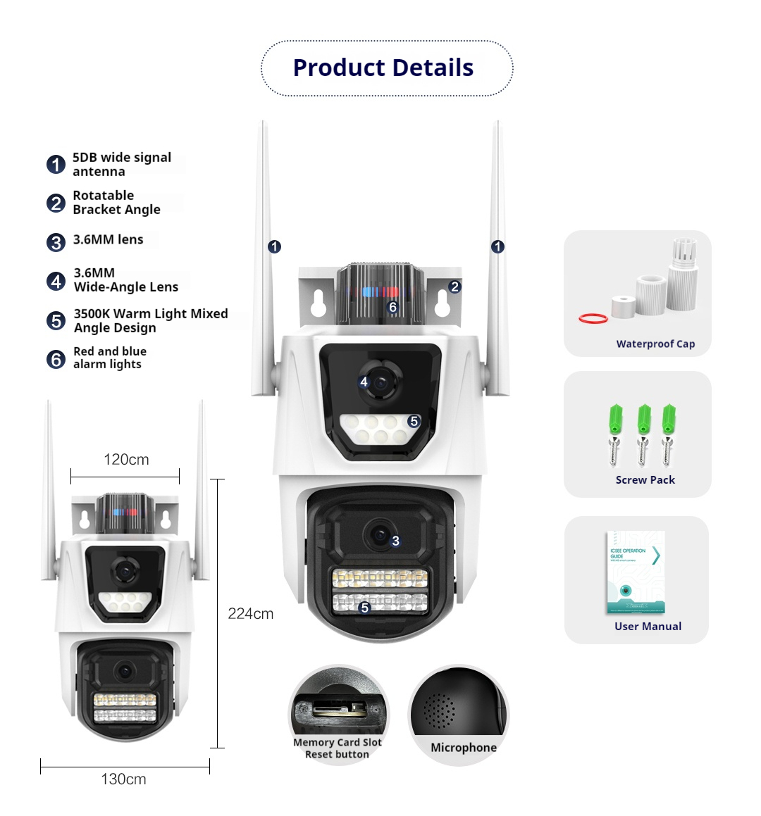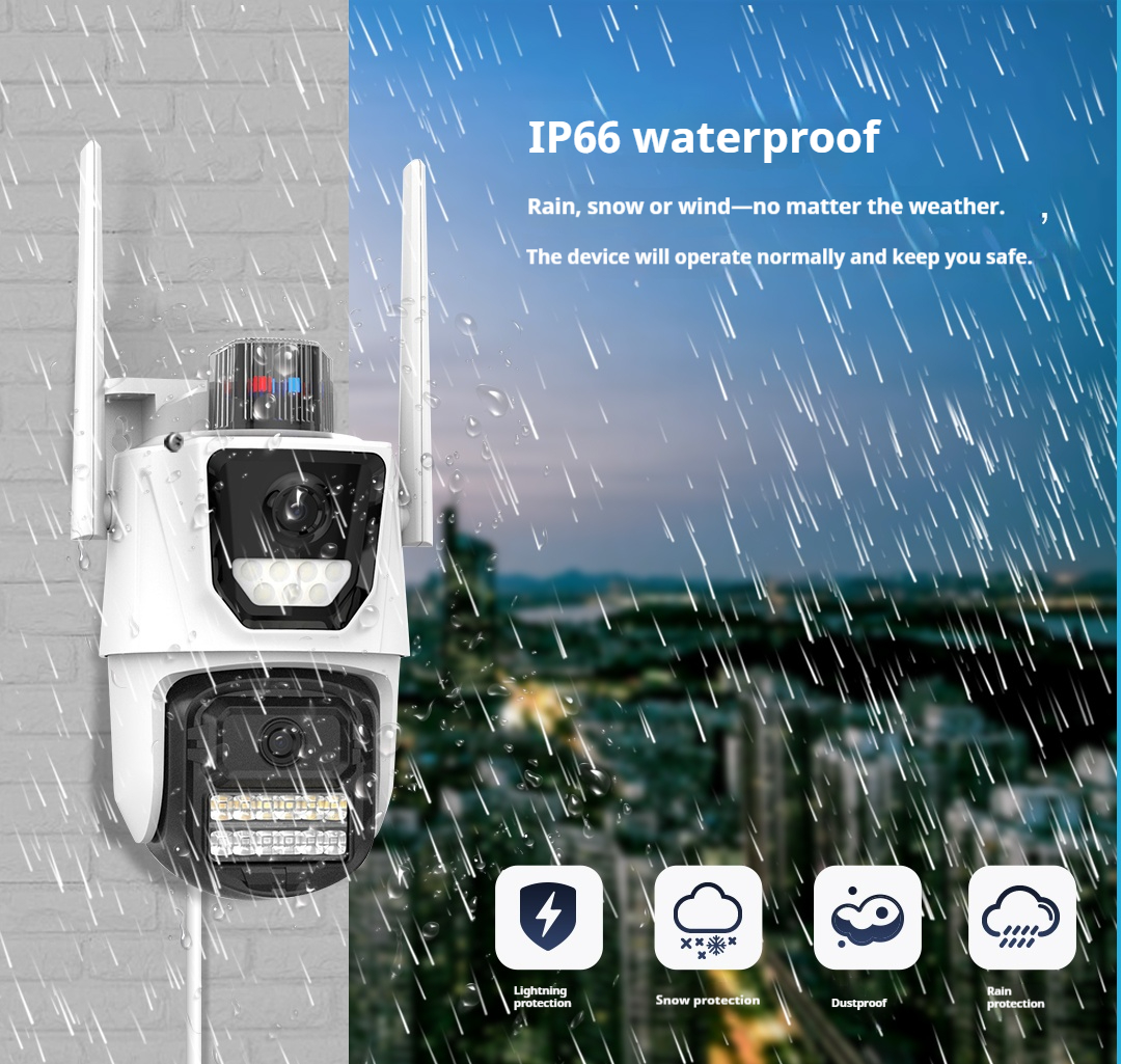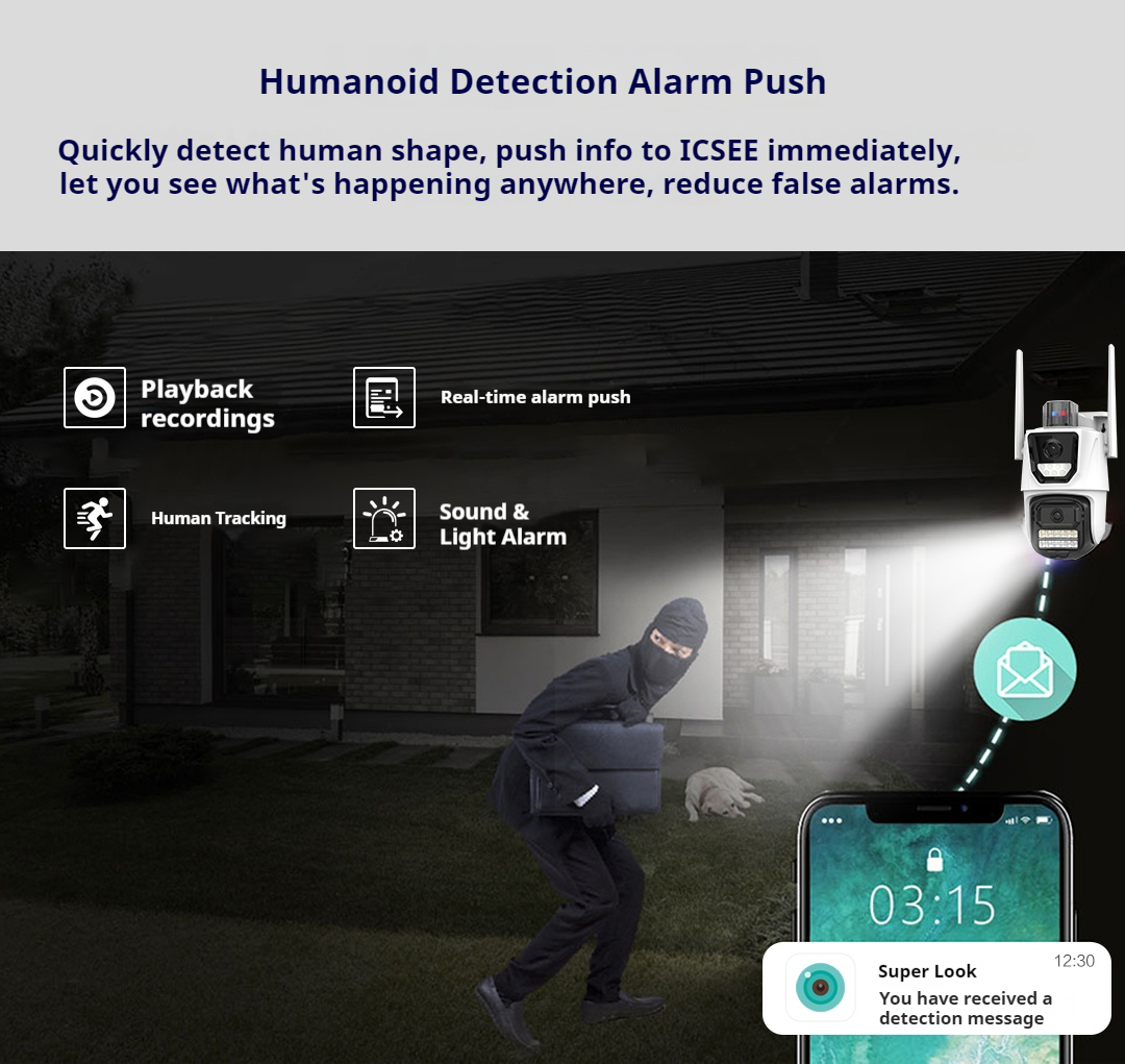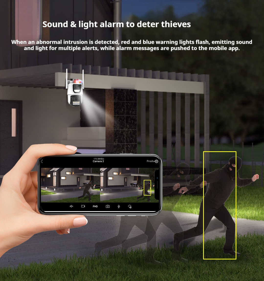 Alert system: Red and blue warning lights with a sound alarm for real-time intruder deterrence.